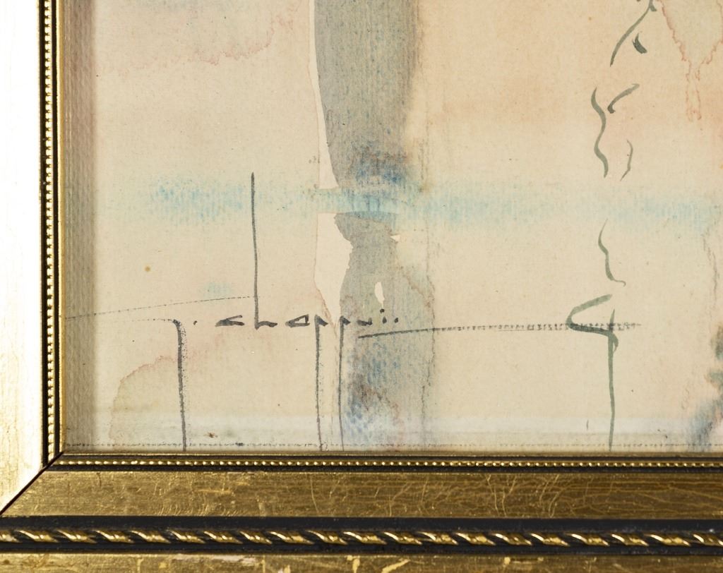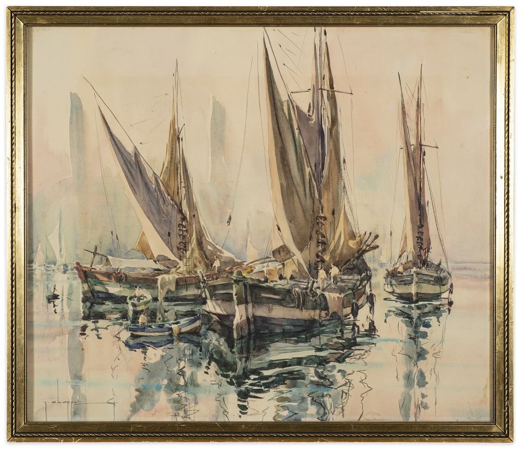 Item/Description: Watercolor painting features tall masted ships in a harbor. Signed lower left. Unknown artist, illegible signature.