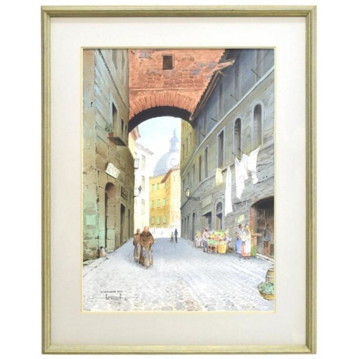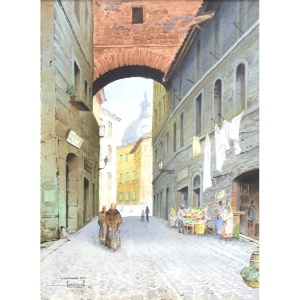 Framed watercolor on paper, "Via Guilio Romano, Roma", signed & titled lower left Amendolla ( Luis Ricardo Amendolla Gaspara, Mexico, 1939 - 2000 ), sight: 25 1/4" H X 17 1/2" W. Overall: 32" H X 25 1/4" W.
