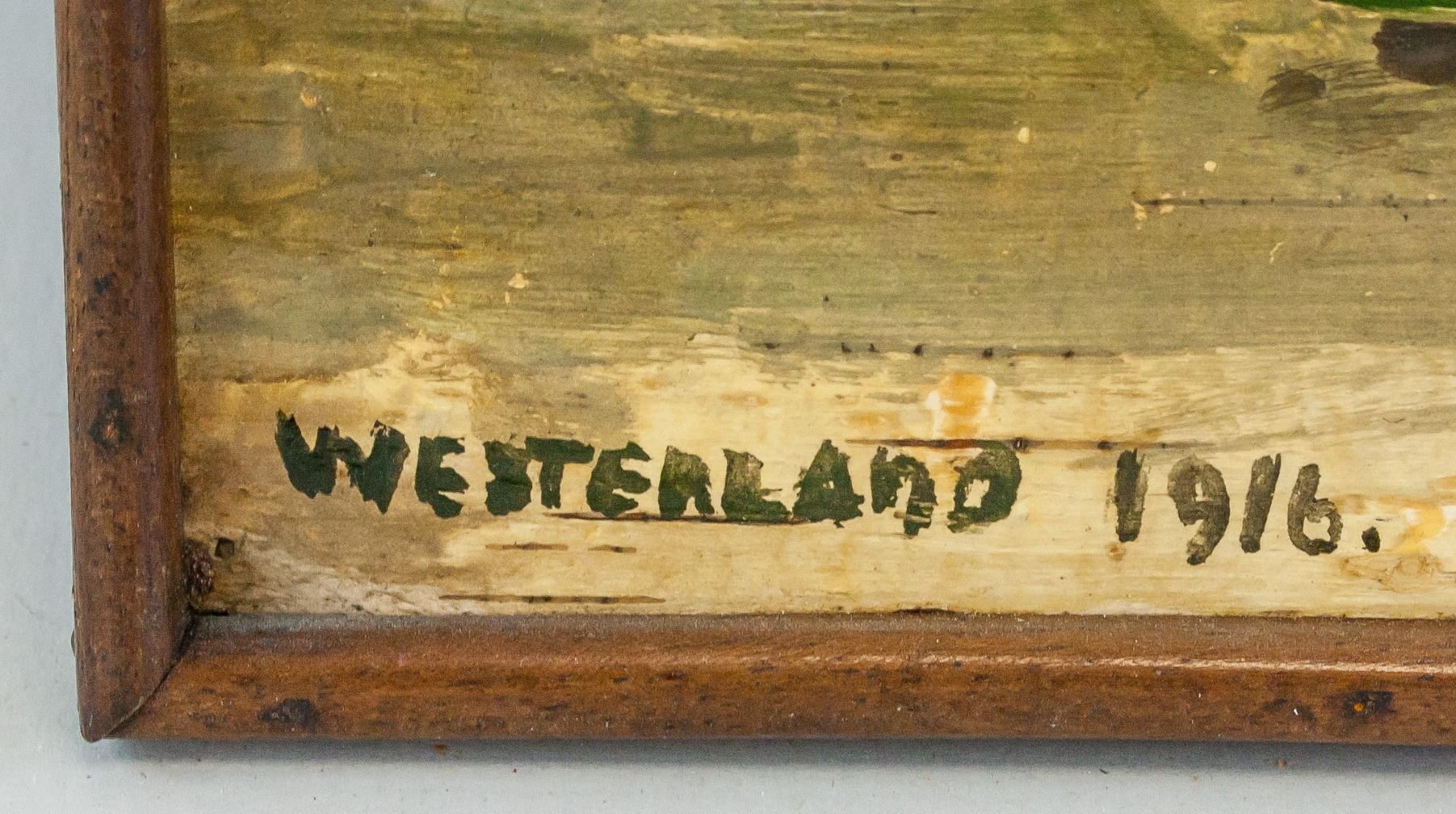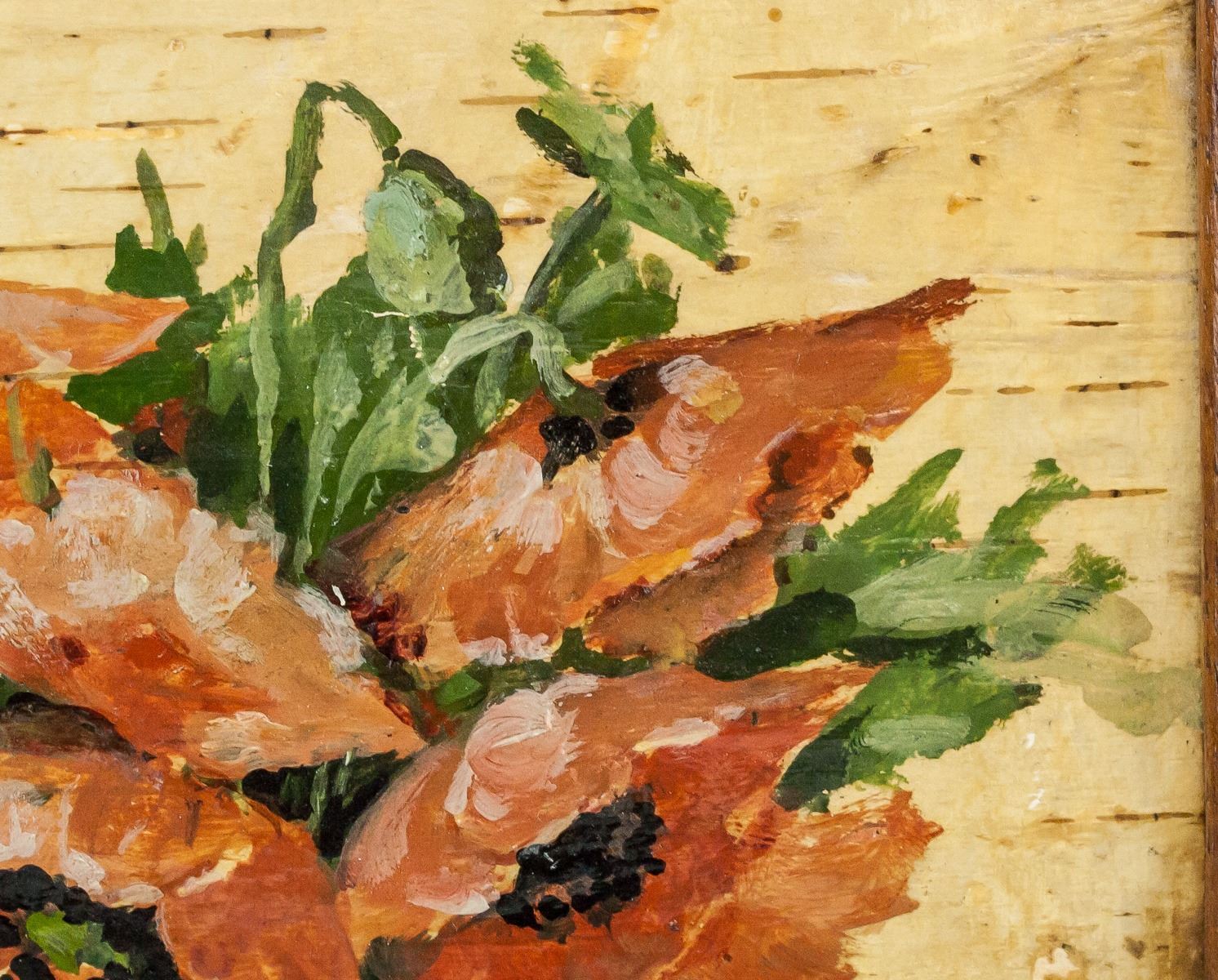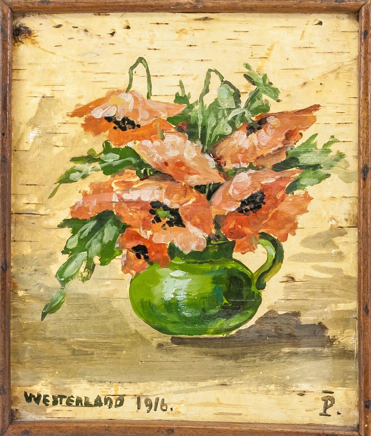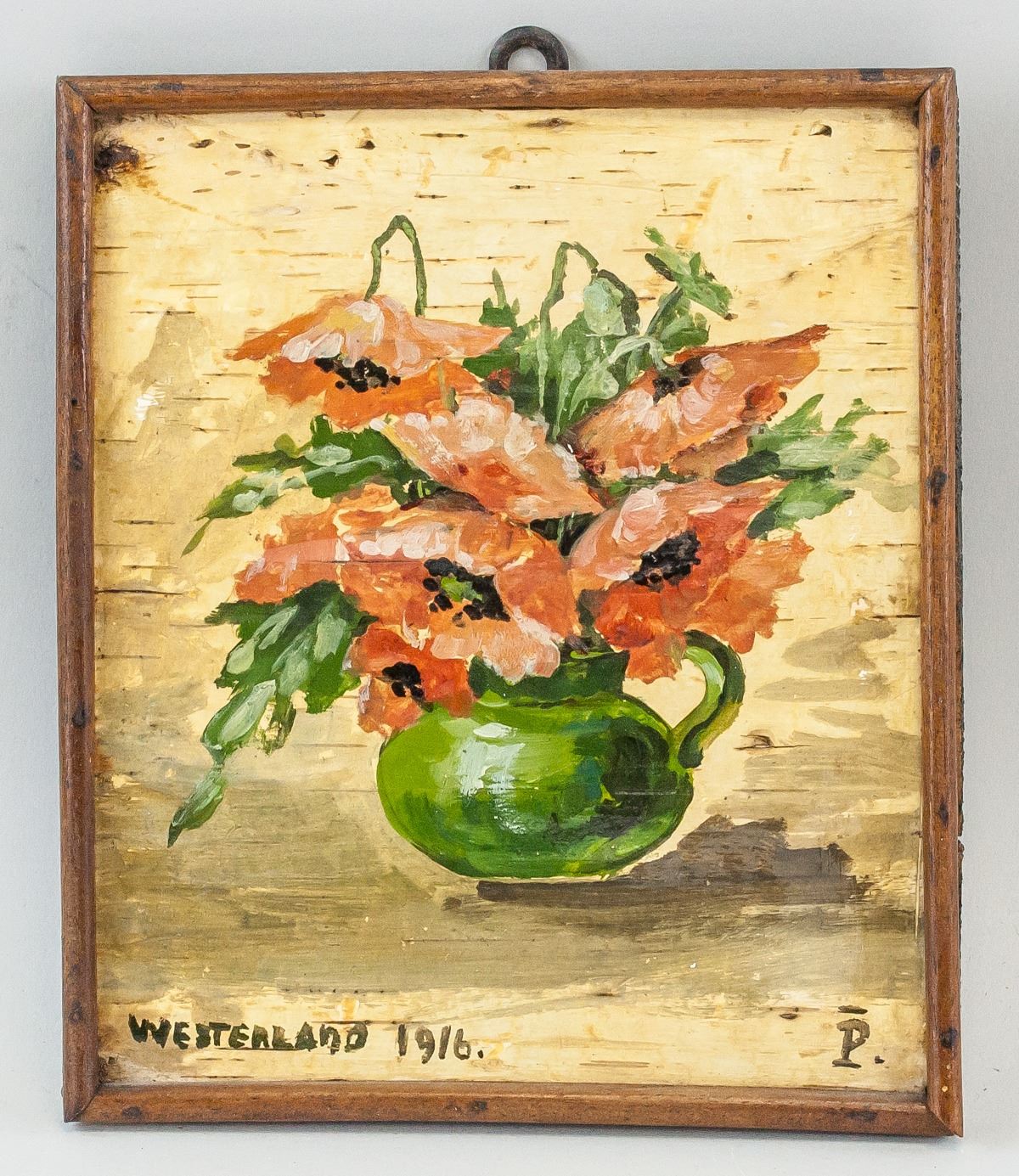 Oil on birch bark, framed. Featuring bouquet of orange flowers in a green jug. Signed "Westerland" in the bottom left corner with "1916" inscribed beside it. The letter "P" is present in the bottom right corner. 18 x 15 cm (7 x 6 inches). PROVENANCE: This lot carries limited provenance from a Private German estate