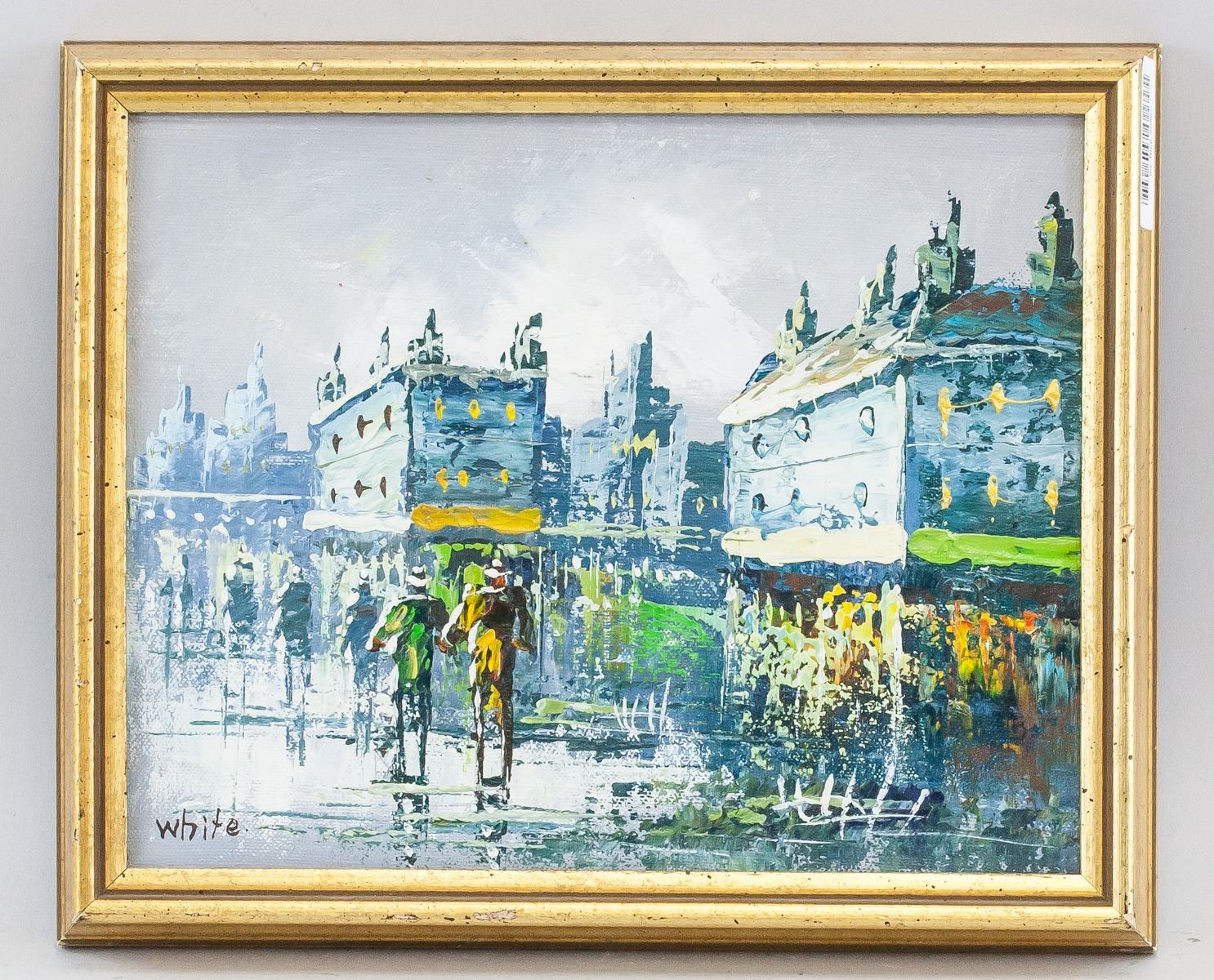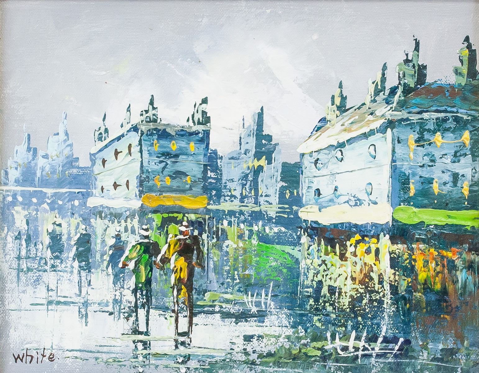 Oil on canvas, framed. Featuring french street scene. Signed "white" in the bottom left corner. "113 0171 10" inscribed on verso. 20 x 24 cm (7.8 x 9.5 in), Frame: 24 x 28.5 cm (9.5 x 11.2 in)