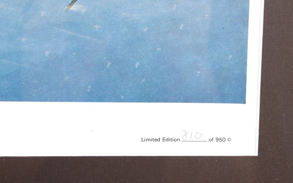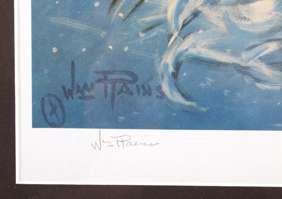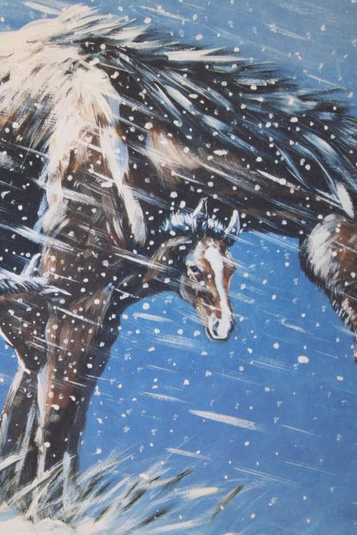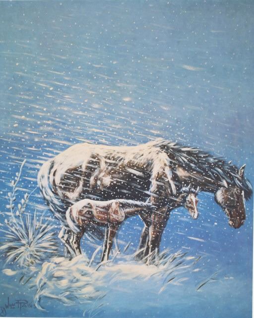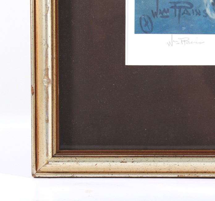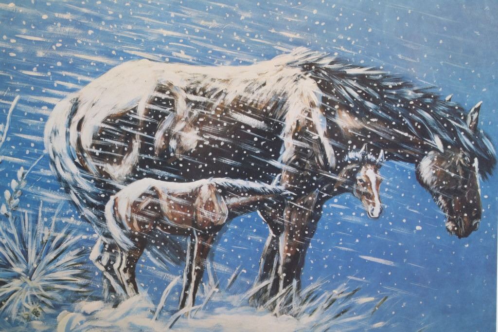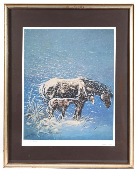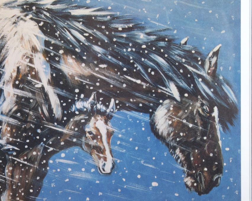 Available in this lot we have a signed William Rains framed limited edition print originating from the late 20th century. William Rains is a Montana artist located in Billings and is known for his wildlife and Native American art. Along with being a talented painter, Rains has produced a number of bronze statues throughout his career. This print depicts three horses, one mare and two foals, as the helps to shelter the foals from a snow storm. The art piece shows excellent impressionist art style with wonderful color. The print is signed twice in the bottom left hand corner and marked "Limited Edition 810 of 950" in the bottom right. The piece is set into a custom gilt gold painted wood frame with a dark brown border around the art. The print shows good condition overall with some light wear across the frame. The frame measures 23 1/2" wide by 29 1/2" tall with the art measuring16 3/4" wide by 21 1/4" tall.