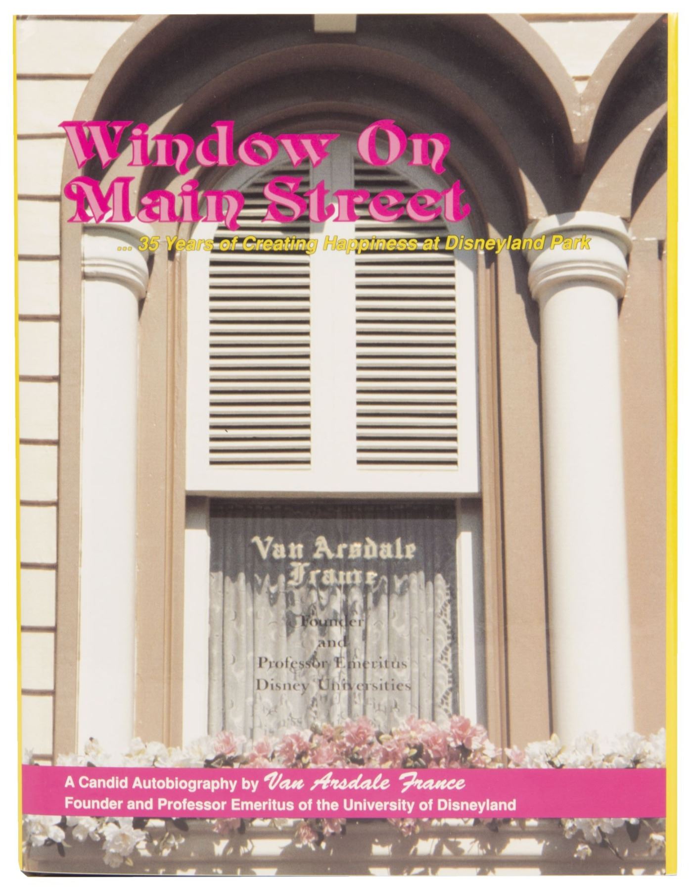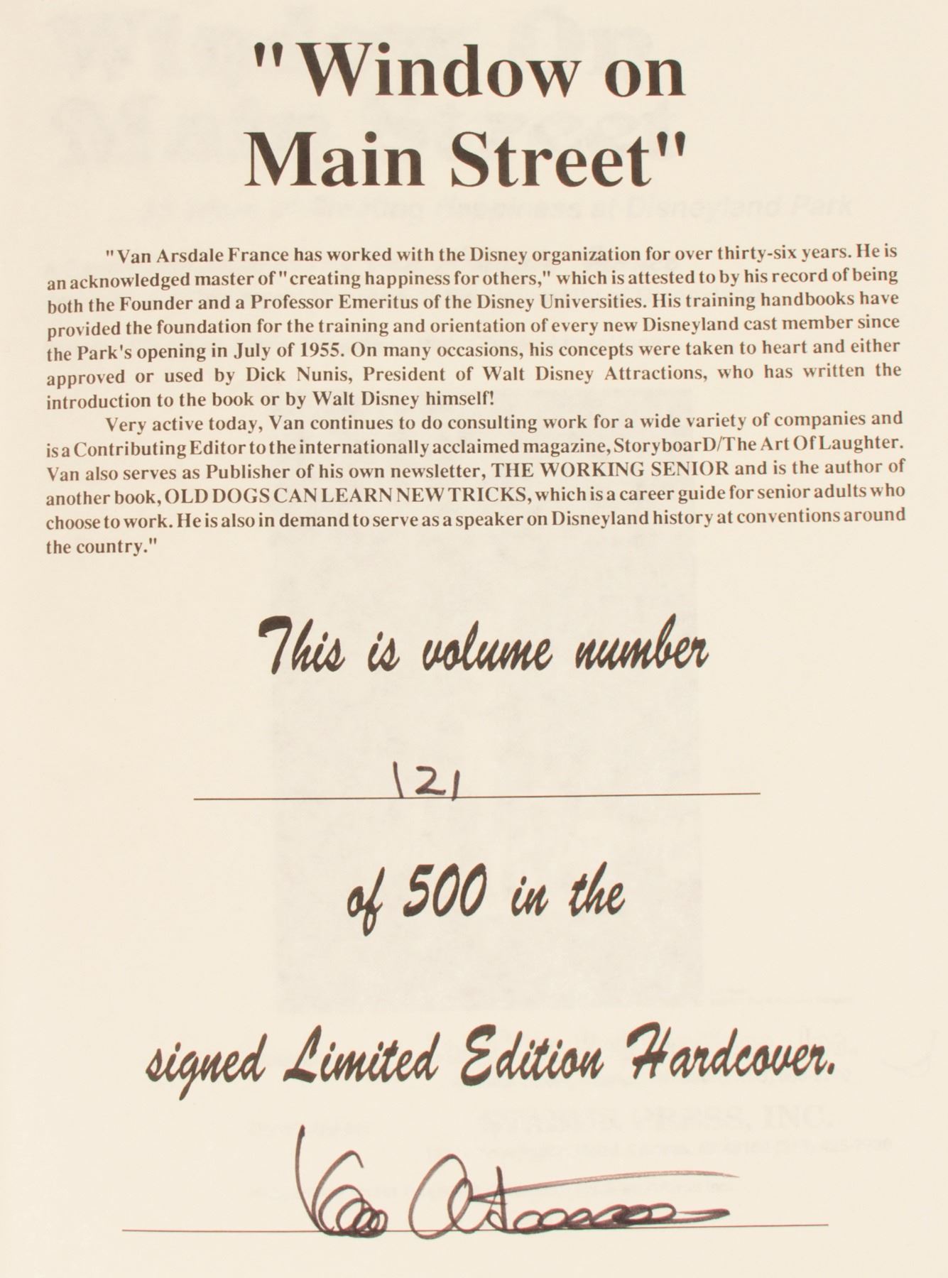 (Disneyland, 1991) A very rare signed hardcover book titled "Window on Main Street" by Van France, Founder and Professor Emeritus of the Disney University. This autobiography contains many rare photographs and personal anecdotes, as well as the story of how Walt Disney's dream became a reality, and how Van helped to "create 35 years of happiness at Disneyland Park." This limited edition hardcover book is number 121 in a series of 500, and measures approximately 11.5"x9". It is in very good condition with minor wear.