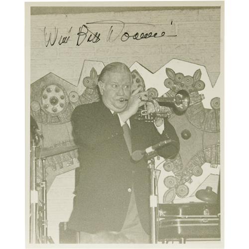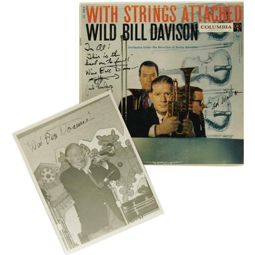 <B>Signed "With Strings Attached - Wild Bill Davidson" Columbia CL 983 Mono LP, with Autographed Al White Silver Print (undated).</B></I> Wild Bill's trumpet playing cooks like a flamethrower! The album cover was autographed by Davidson and his sidemen Jack Lesberg (bass), and Bob Wilber (clarinet). Also included in this lot is an Al White "jazz party" silver print, autographed by Davidson. Price sticker on back cover. Condition: VG/G. <I>From the Al White Jazz autograph archive.</B></I>