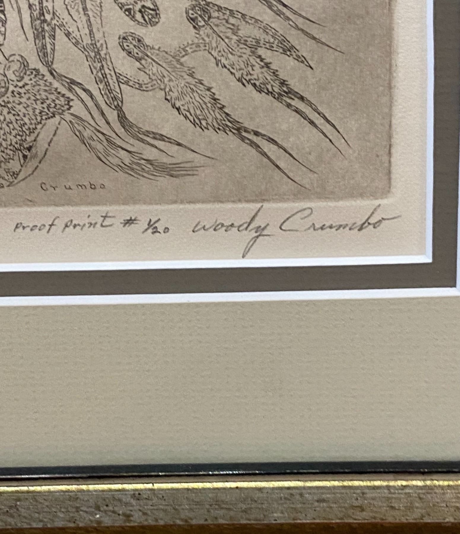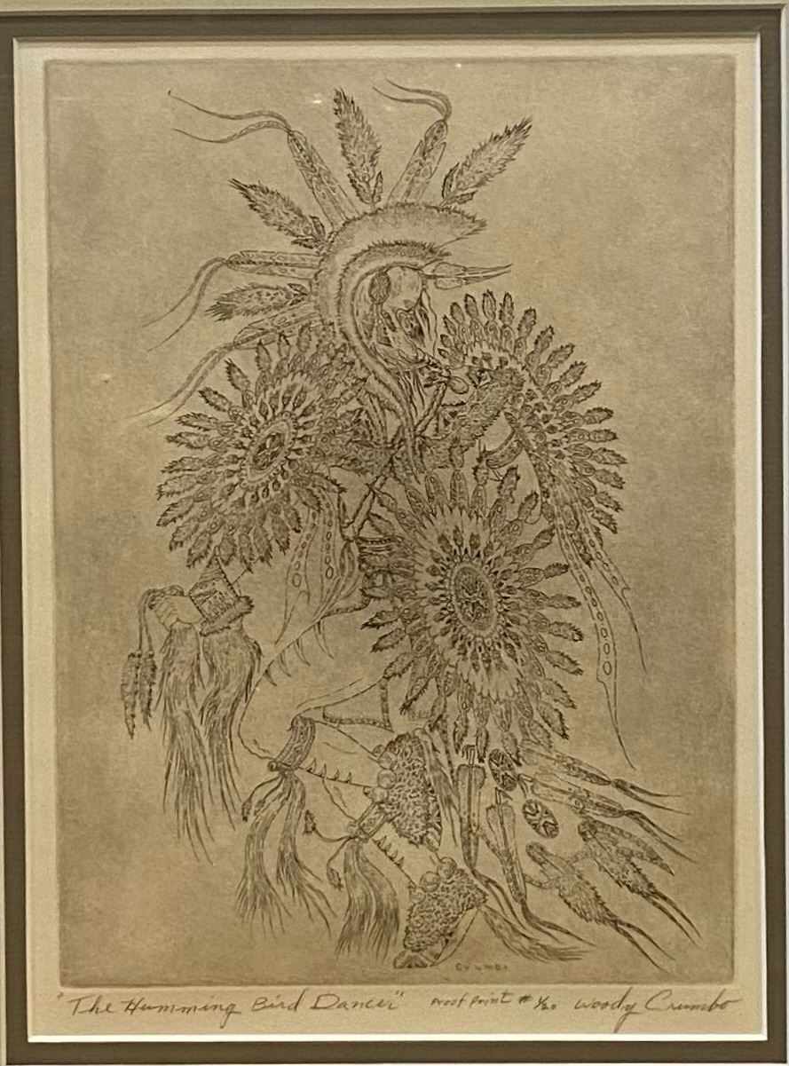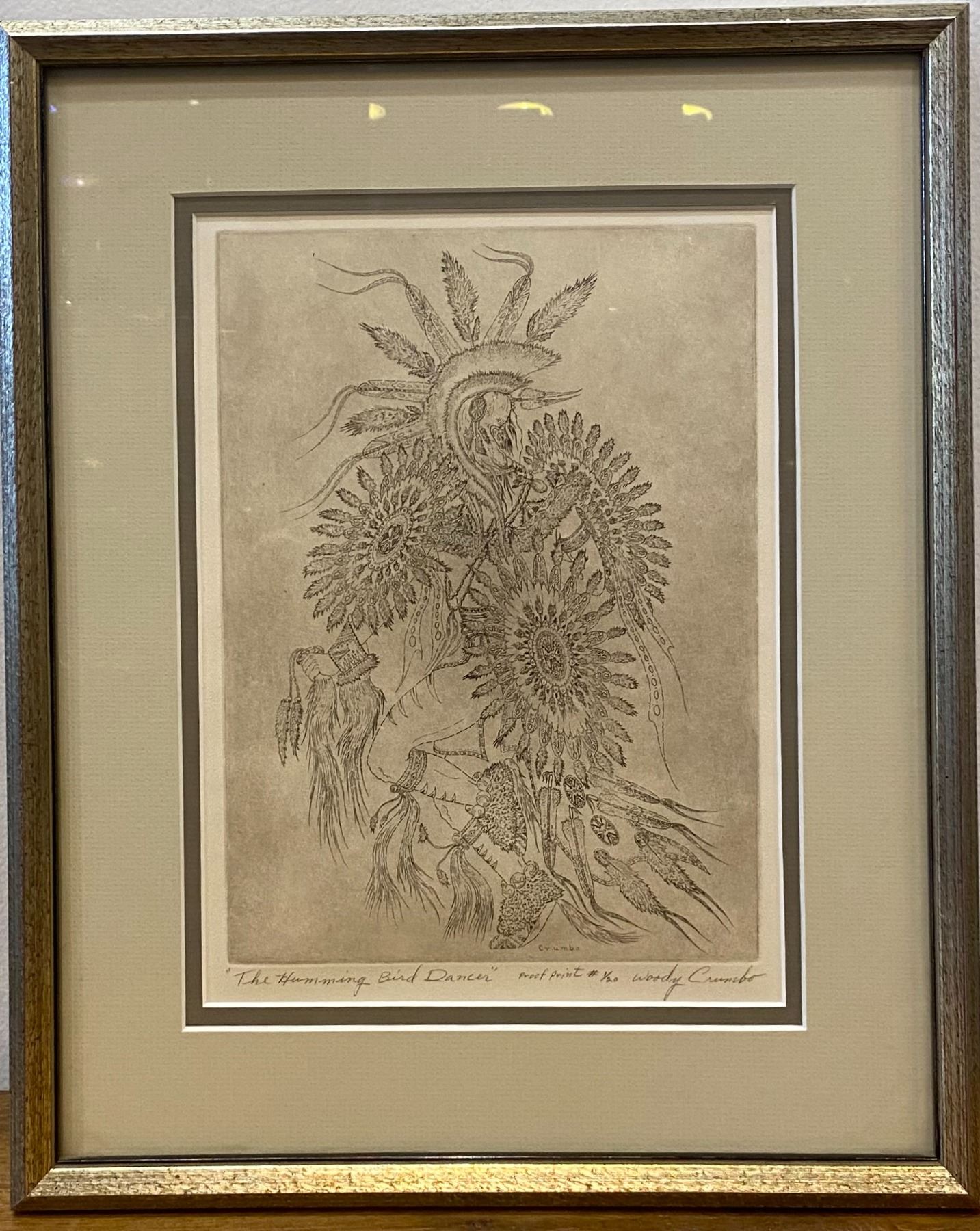 Proof Print #1 of only 20 of the Humming Bird Dancer by Woodrow Wilson "Woody" Crumbo (1912-1989) Potawatomi. The Print is signed Crumbo, the piece is pencil signed Woody Crumbo at the right-side underneath of the print.