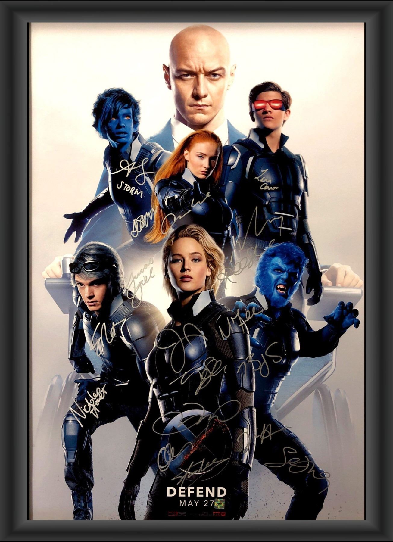Autographed by Jennifer Lawrence, Oscar Isaac, Tye Sheridan, Michael Fassbender, Olivia Munn, Alexandra Shipp, Lana Condor, Evan Peters, James McAvoy, Sophie Turner, Lucas Till, Rose Byrne, Josh Helman, Nicholas Hoult, Kodi Smit-McPhee, Ben Hardy, Bryan Singer and Stan Lee