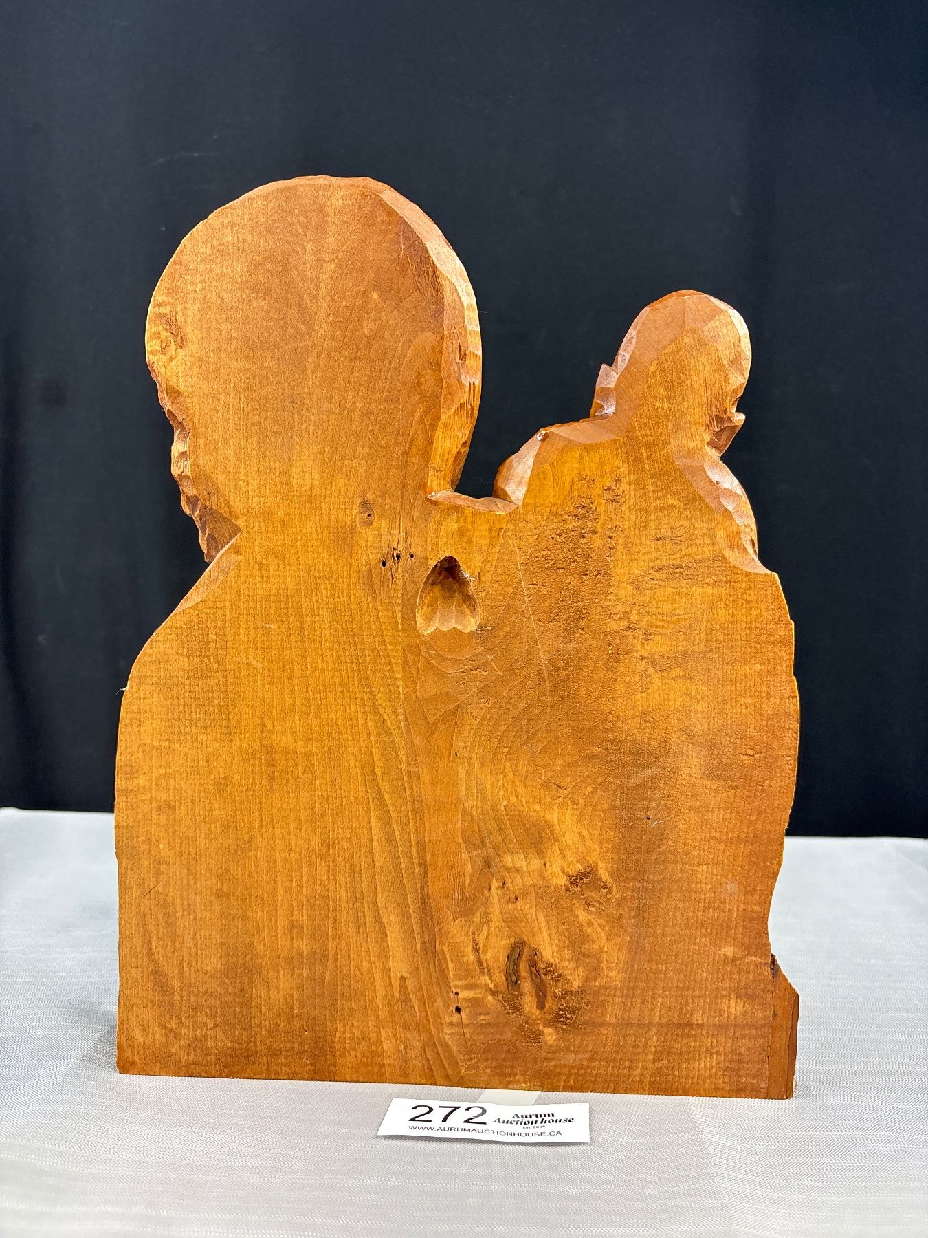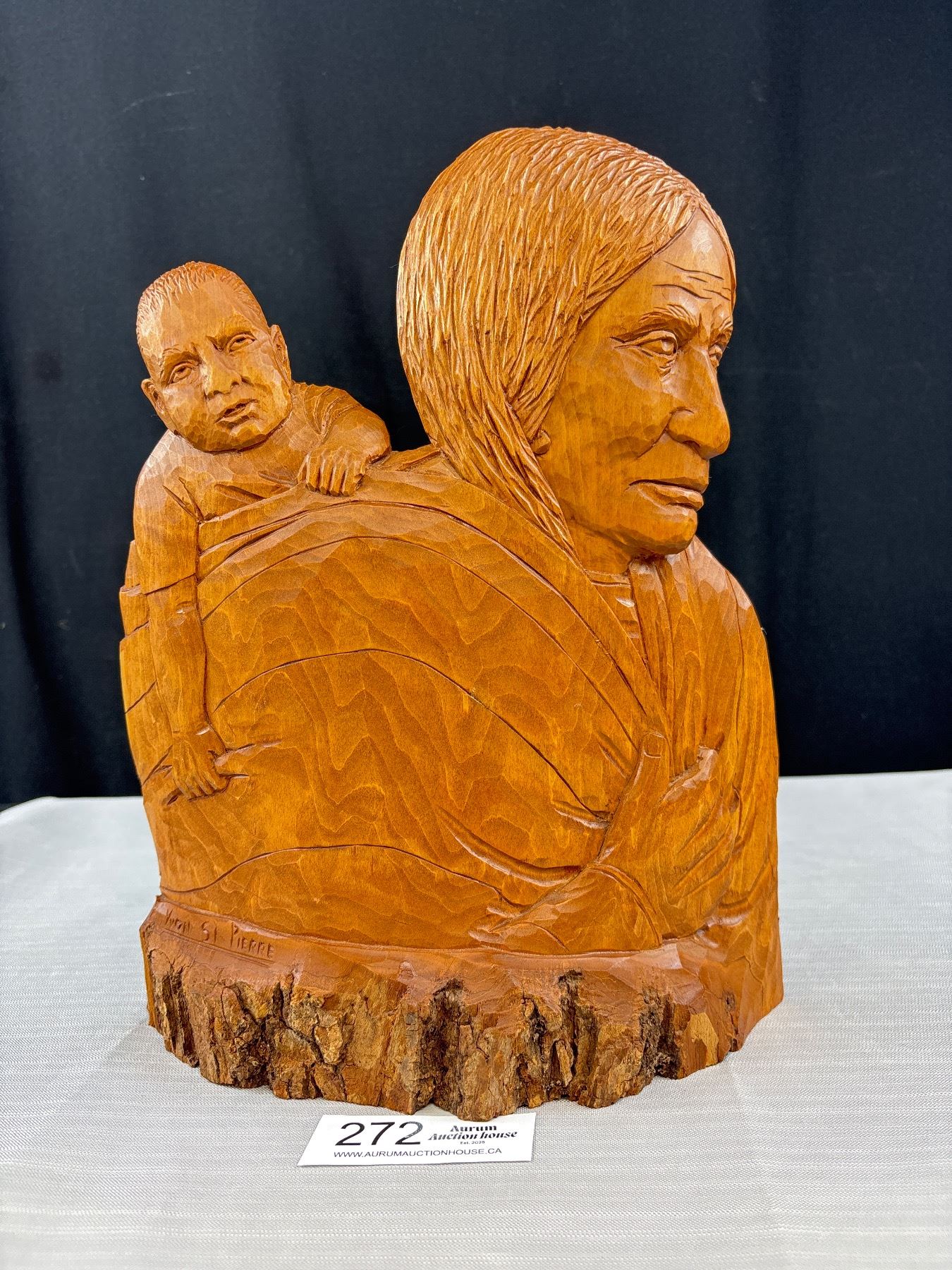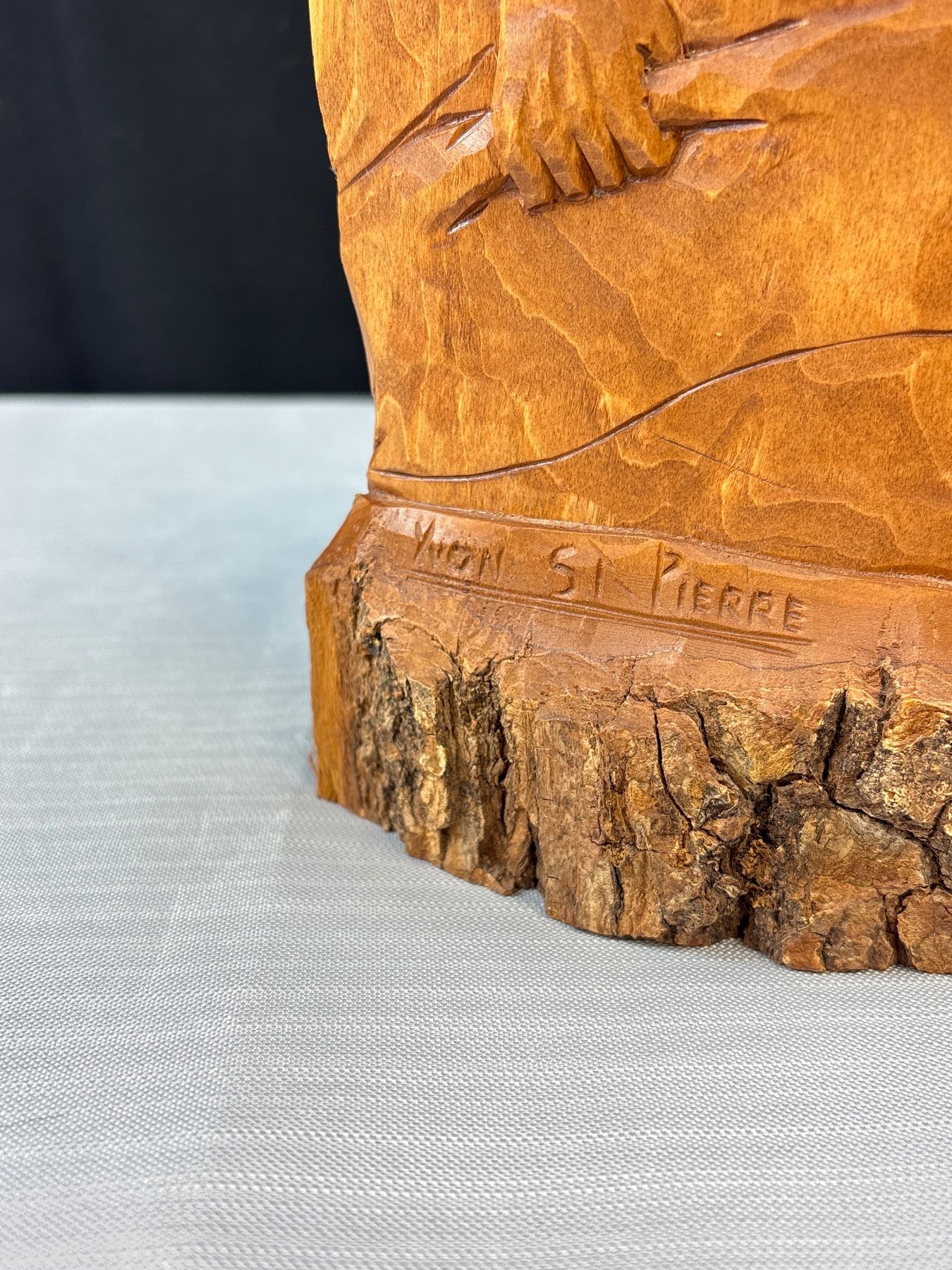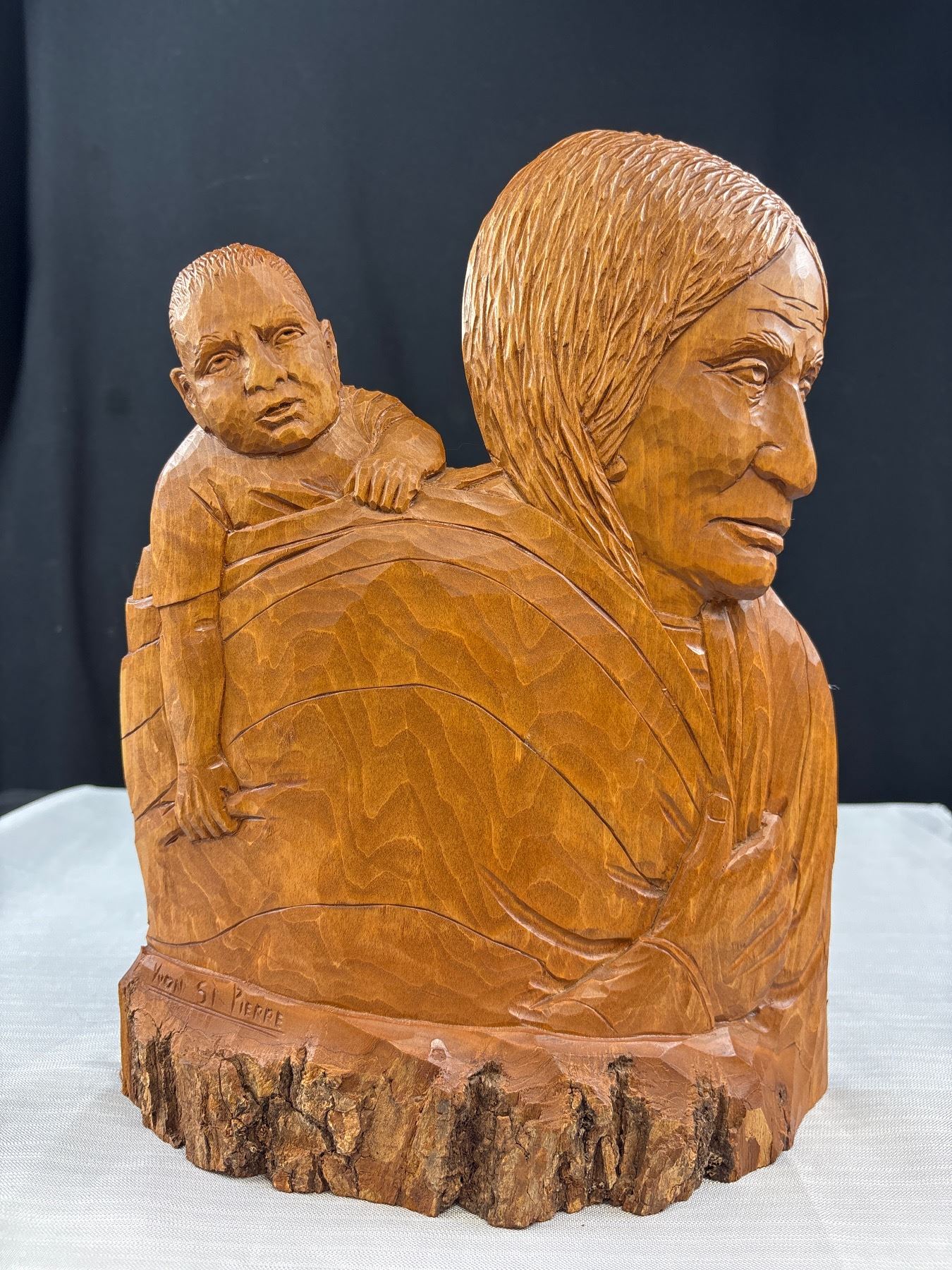Signed Yvon St. Pierre Wooden Carving Native Woman Carrying Baby