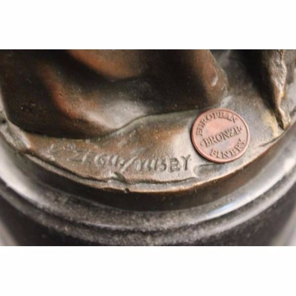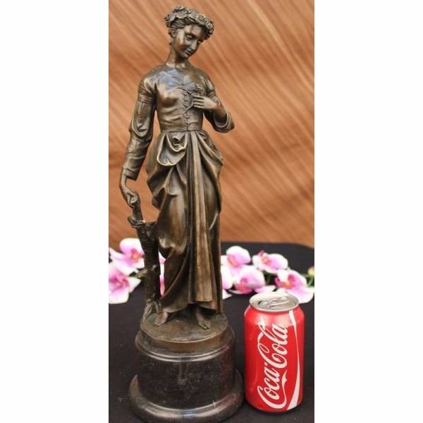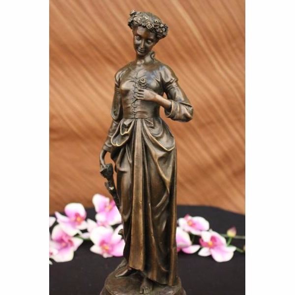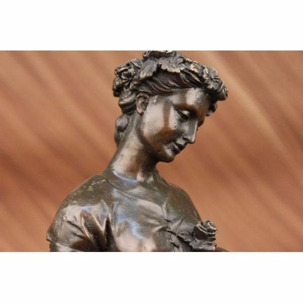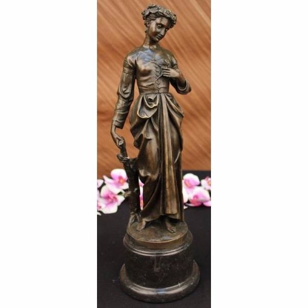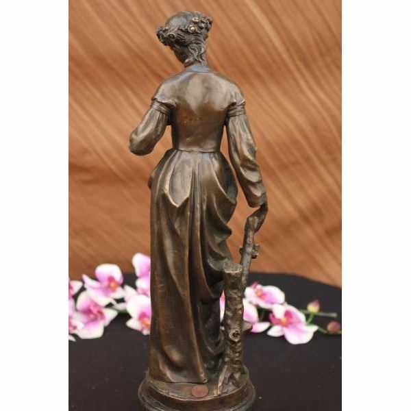 A young maiden steals a leisurely moment in the day to relax. She holds onto a tree branch and she stare down to the floor. She wears a long goddess-like dress that come all the way down to her bare feet and her long sleeves are loose at the bottom and tight at the top. The dress has this beautiful v neck trim to it exposing only her collar bone and around the hips she has more draping to make her look more elegant, her hair is up and she wears a flower wrap around it. 100% bronze and handmade, this sculpture was cast using the "Lost Wax Method" and mounted on a marble base and is signed Zegut/ Tusey. Condition: This sculpture is in perfect condition. Bronze Dimensions with Marble Base:Height 17" x Width 7" Marble Dimensions: diameter 5" . Height without base: 13" Weight : 14 LBS Inventory 97B7726379