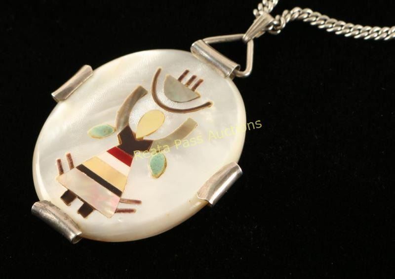 On a large piece of mother of pearl are pieces of other shell, coral, onyx, and gaspeite held within a sterling silver frame. Signed on back by artist, also signed 'Sterling'. Chain marked sterling. Pendant measures 2 3/8" long (including bale) by 1 5/8" wide, chain is 16.5".