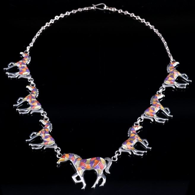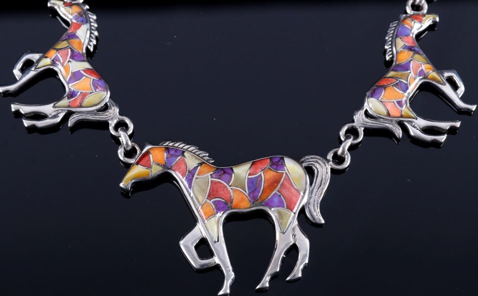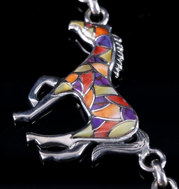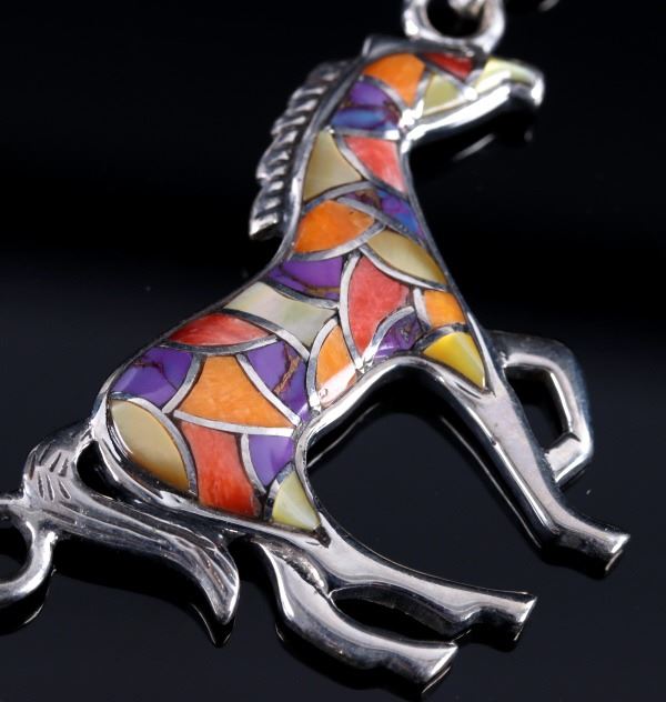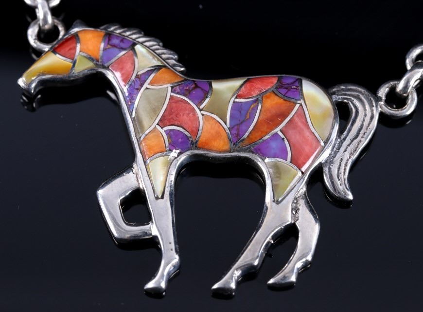 For bidding in this lot is a signed Zuni Native American Indian mosaic equestrian charm necklace. The necklace boasts seven horse charms, each inlaid with Sugilite, mother of pearl, and spiny red, orange, and pink oyster. Each charm depicts a horse in mid trot. The main charm is signed on the back "Sterling - T". Overall, the necklace shows very-good condition, with a bright white silver tone, and tightly set stones. When unclasped and stretched out, the necklace measures 20 1/2" long.
