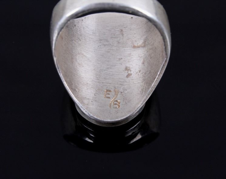 Offered for your bidding pleasure we have this signed Zuni Turquoise and Sterling Silver ring. This ring shows a stunning example of the Hummingbird design with the Sleeping Beauty Turquoise inlay set on a Sterling Silver base. This piece is signed by artist "E/B" whose signature we could not identify. The ring shows excellent condition and measures US size 11.