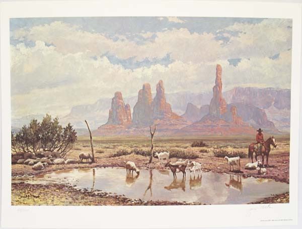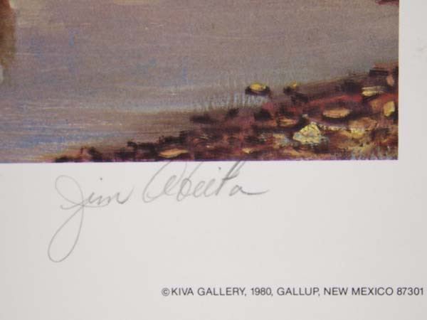 Signed and Numbered Jimmy Abeita Print, measures 15'' x 22'', hand signed in pencil 60/1000, FYI: ''Jimmy was born and raised in New Mexico. He attended the American Academy of Art in Chicago, a two year course that he completed in nine months. In the 1970's he moved to the Navajo Reservation in Arizona, where he began painting full time. Abeita has won numerous awards nationwide.''