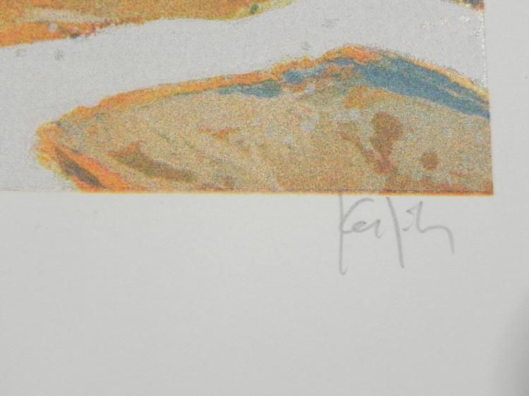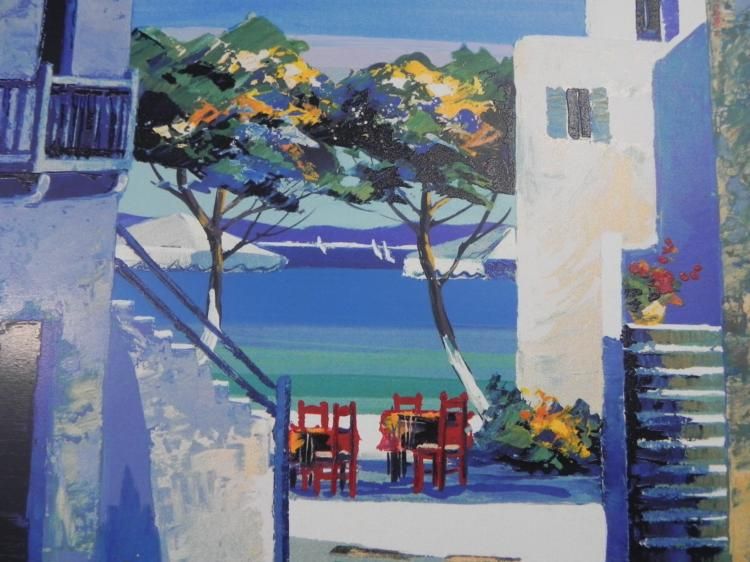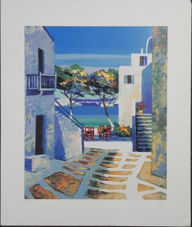 Artist: KerfilyTitle: Mykonos * II * Medium: Serigraph print * on paperSignature: Signed by artist, * lower rightEdition: 23/250, lower * left * Image * size: 16 1/2" x 20"Sheet size: 22" x * 26" * Condition: Very good; * some slight creasing to right margin that can * be matted out * Biography * Kerfily is as refreshing * and spirited as his paintings. He creates * enticing images through bold palettes and captivating compositions. * Inspired by the beauty of the landscapes that surround him, Kerfily * paints with a bright, pure palette. He is an artist of great talent with * a very strong capability of capturing nature at its very * best. * * Inspired by the Mediterranean, the South of * France, Corsica, and Greece, * his enthusiasm for his art is fully evident in his windswept seascapes * and timeless, sun-dappled village scenes. Noted for his power to evoke * emotion, opulence of light and distinctive color harmonies. Kerfily * translates the ordinary moment into the magical, inviting us to be * revitalized by the world's simple pleasures. He is recognized for the * color schemes of vibrant primary hues. He uses it masterfully to capture * the feeling of a majestic burst of * sunshine. * * *Retrieved * from: * http://www.artrev.com/art/artists/biography.asp?aid=2180&artist=Kerfily *