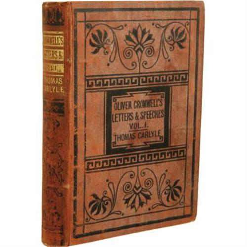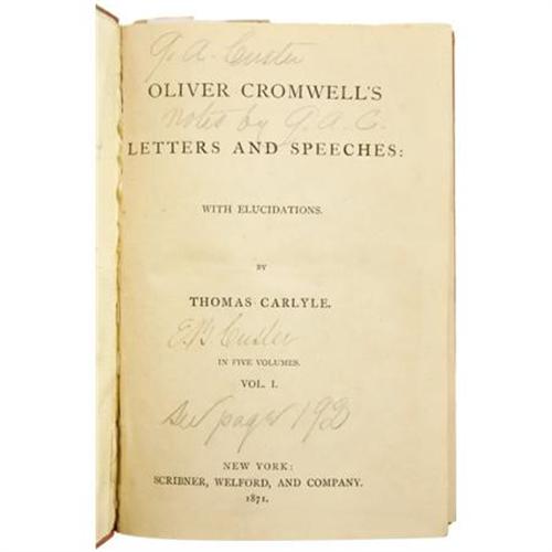 <B>General George Armstrong Custer: From General Custer's Library, Signed and with Annotations by the General: <I>Oliver Cromwell's Letters and Speeches: With Elucidations by Thomas Carlyle.</B></I></B></I> (New York: Scribner, Welford, and Company. 1871). Later edition (includes prefaces to the second and third editions). Volume I only (of five). Written on the title page in the hand of Elizabeth Custer: “G.A. Custer, Notes by G.A.C., See page 192.” Additionally signed on the title page by Custer's wife: “E.B. Custer.” Annotated and marked by General Custer on page 192 with a word and parentheses marks, other marks in the book, most consisting of underlines, shoulder lines and parentheses, by an unidentified hand. On several occasions there are brief notes of a few words in the shoulder margin. Octavo (6.5” x 4.5”). 290, 2, publisher's ads pp. Publisher's reddish-brown cloth lettered and decorated in black. Cloth is faded and heavily rubbed, with some evidence of water damage. Sheets are very clean and fresh. A wonderful example of a book from the library of General Custer, with indications of the passages that perhaps influenced his own speeches.<BR><BR><b>Shipping:</b> Books & Catalogs (<a target="_blank" href="http://www.heritageauctions.com/common/shipping.php">view shipping information</a>)