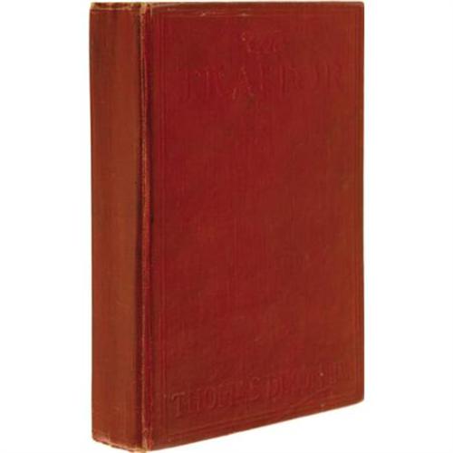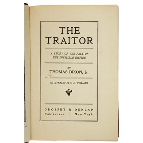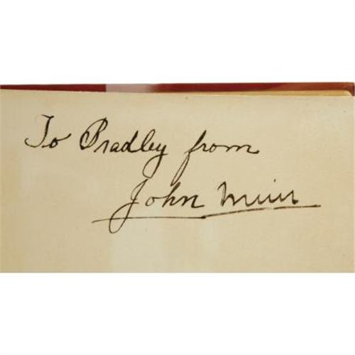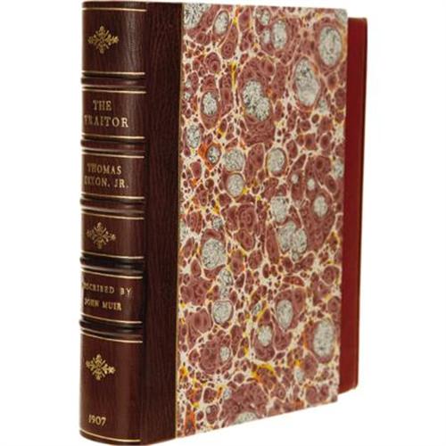 <B> John Muir Thomas Dixon, Jr.: <I>The Traitor.</B></I></B></I> <B>Inscribed by Naturalist John Muir.</B></I> Illustrated by C.D. Williams. (New York: Grosset & Dunlap Publishers, 1907 ). Early printing, boldly inscribed by John Muir on the front free endpaper: “<I>To Bradley from John Muir.</B></I>” Octavo (7.5” x 5”). 331 pages. Illustrated. Publisher's red cloth, lettered on the front cover and spine. General soiling and rubbing, one page loose and tattered around the edges, front free endpaper discolored, otherwise a very good copy. Housed in a quarter morocco book-backed slipcase with the spine in compartments with five raised bands, and tooled in gilt.<BR><BR><b>Shipping:</b> Books & Catalogs (<a target="_blank" href="http://www.heritageauctions.com/common/shipping.php">view shipping information</a>)