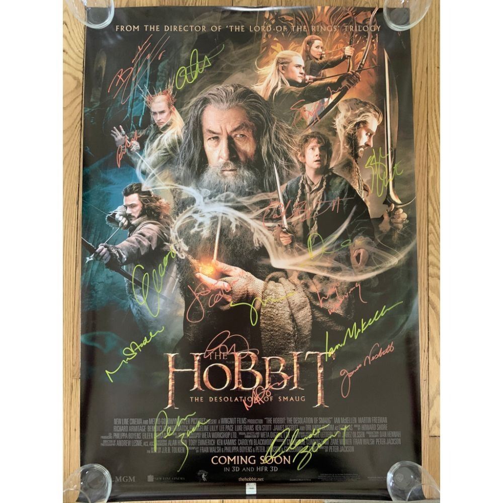 Signed by:  Orlando Bloom, Hugo Weaving, Richard Armitage, Ian McKellan, Lee Pace, Stephen Hunter, Luke Evans, Cate Blanchett, Benedict Cumberbatch, James Nesbitt, Martin Freeman, Evangeline Lilly, Stephen Fry, Dean O’Gorman, John Callen, Aiden Turner, Maek Hadlow, Peter Jackson