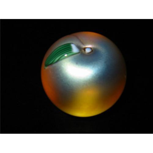 This gorgeous peach irrediscent shimmered paperweight is amazing. It has artist's signature and numbers Most likely well known unable to identify " ancente or jqncente e flciu" - " w0719Q9" . The color is soft peach with accent of goldtone green and decorated with glass green leaf no stem. It is Beautiful and in excellent condition. 3 inch by 3 by 1.6 where the signature is located. photographic blemishes!
