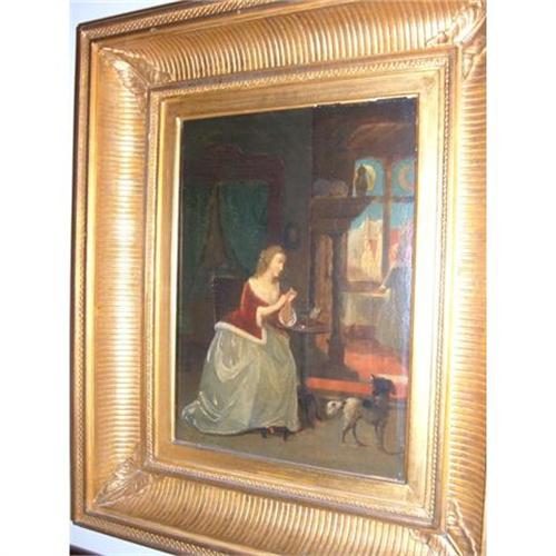 A wonderful oil on panel of a woman threading a needle while a dog looks on and another woman stares out a window. Signed, Jules Boulanger, lower left. Wonderful carved, gold frame. Minor chips to frame. A very well done painting.