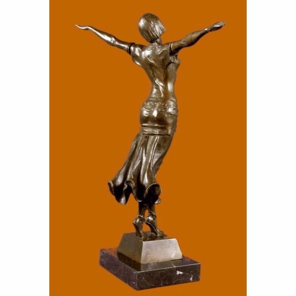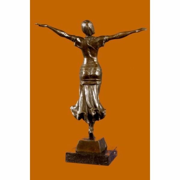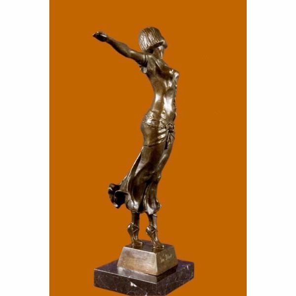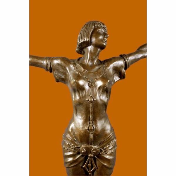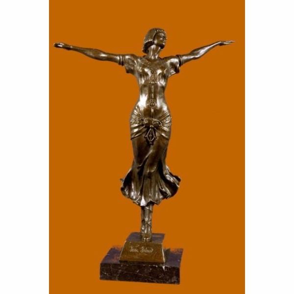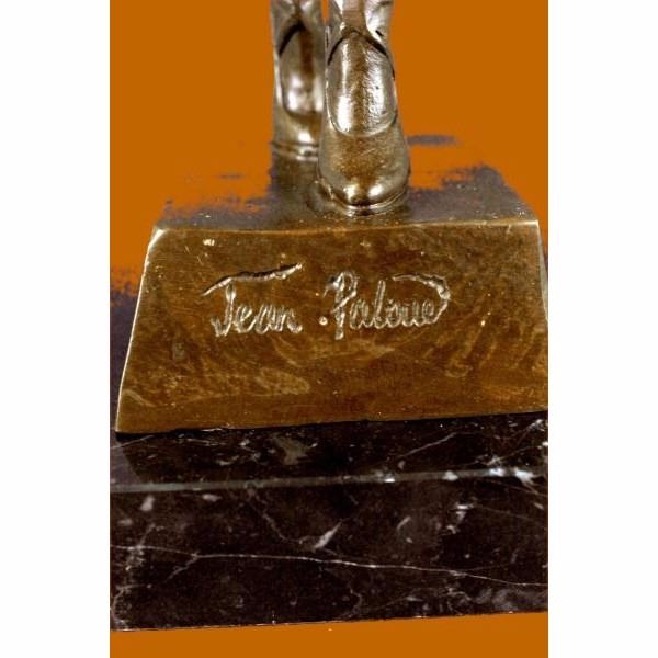 A great dancer is so into her craft that she often looks lost in a trance as she moves. Lost in the movement of her graceful body. This nude dancer is just that. Balancing only on her toe with the other leg in posse. Her entire body is arched in a backwards 'C' position with her curved arms forming the top of the position. This statue was created using the lost wax method. It is on a black marble base. It is signed by the artist Jean Patoue. Condition: This sculpture is in perfect condition. Bronze Dimensions with Marble Base:Height 16" x Width 12" Marble Dimensions:5" X 5" Height without base: 15" Weight :9 LBS Inventory : 74XNCH2026B9047