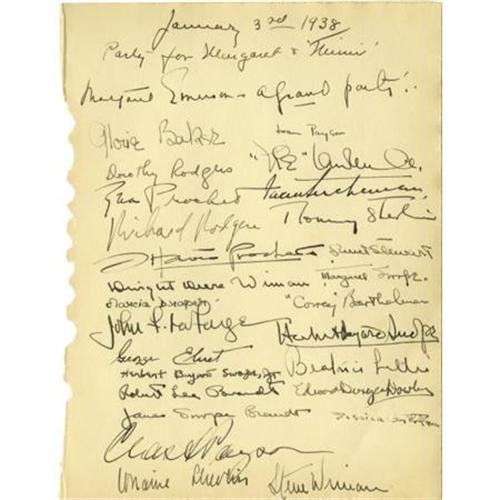 <B>Signed page from Clifton Webb's Guest Book, Including the Signatures of Richard Rodgers and Beatrice Lillie.</B></I> This page from Webb's guest book is dated January 3, 1938, and features the signatures of legendary musical composer Richard Rodgers, the famed British comedienne Beatrice Lillie, movie star Richard Barthelmess (who signed with his nickname "Corey") and Herbert Bayard Swope, first winner of the Pulitzer Prize for reporting. Imagine the conversations at this party! Excellent condition. <I>Accompanied by LOA from PSA/DNA.</B></I><BR><BR><b>Shipping:</b> Flat Material, Small (<a target="_blank" href="http://www.heritageauctions.com/common/shipping.php">view shipping information</a>)