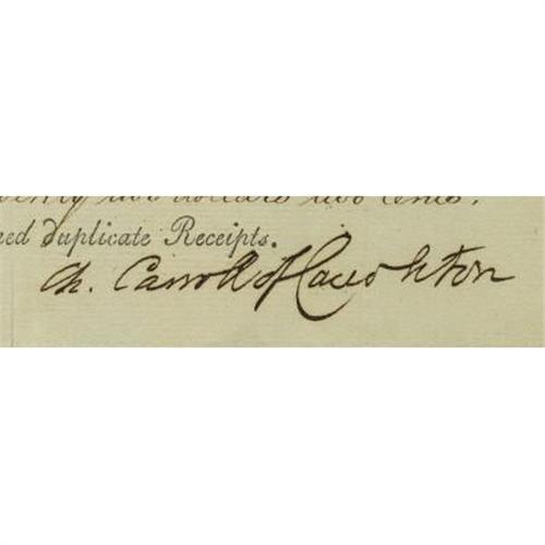 <B>Declaration of Independence Signer Charles Carroll of Carrollton DS,</B></I> “<I>Ch. Carroll of Carrollton,</B></I>” one page, partially printed, Maryland (probably Annapolis), October 18, 1805. Carrollton here accepts $72.02 received from United States bonds. Very fine condition. <I>Ex. Henry E. Luhrs Collection</B></I><BR><BR><BR><b>Shipping:</b> Flat Material, Small (<a target="_blank" href="http://www.heritageauctions.com/common/shipping.php">view shipping information</a>)