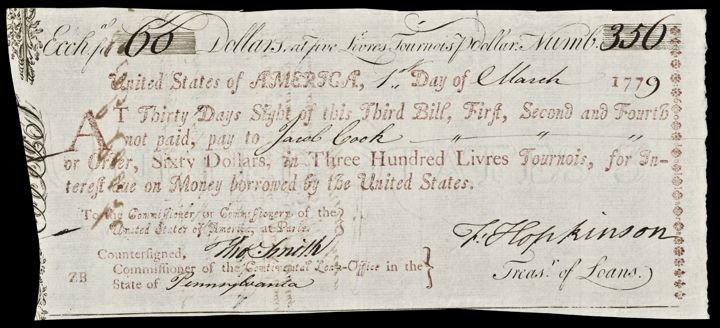 “To the Commissioner or Commissioners of the United States of America, at Paris. - Countersigned, Tho(mas) Smith - Commissioner of the Continental Loan-Office in the State of Pennsylvania -- (Signed) F(rancis) Hopkinson - Treasr. of Loans.”