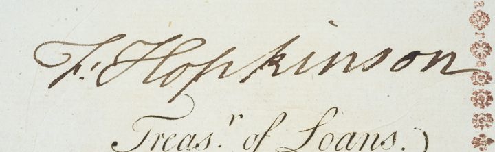 Francis Hopkinson, signer of the Declaration of Independence, signs this bill of exchange as Treasurer of Loans. Francis Hopkinson (September 21, 1737 – May 9, 1791), an American author, was one of the signers of the Declaration of Independence as a delegate from New Jersey.