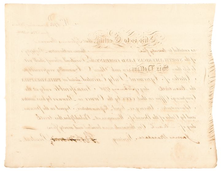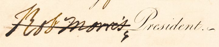 March 10, 1795, Partly-Printed Document Signed, “Robt Morris,” as President of the North American Land Company, Philadelphia, 1 page, on laid watermarked paper measuring 9.75” x 12.75”, Choice Crisp About New. Countersigned by James Marshall (Morris’ son-in-law, and brother of Chief Justice John Marshall). This magnificent looking Document has a scalloped left edge, and is a stock certificate of the North American Land Company, for twenty-five shares in the name of Sylvanus Bourne. Morris’ large 2.75" long, extremely bold brown signature is found at lower right with a fine manuscript cancel with document is fresh and clean with some light creases. A beautiful specimen that is perfect for framing or display.