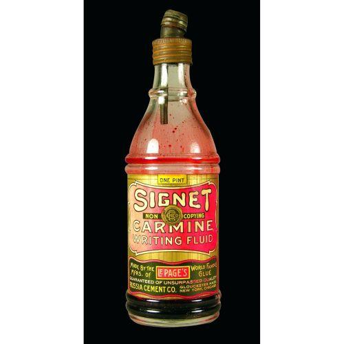 Signet Carmine Writing Fluid Bottle, made by Le Pages Glue Company. Original paper label and spout. Good condition. 9 1/2 inches tall.