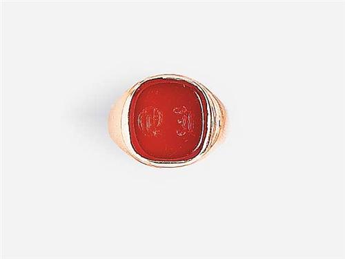 14 K gold, caul type, cornelian stone with R. D. initials, circa 1900, marked, weight: 6.2 g, diameter: 17.5 mm, worn.
