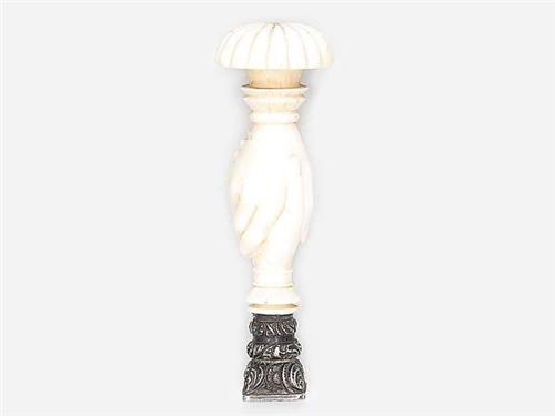Silver, engraved coat of arms. The handle is carved ivory, hands. Minor chips on the ivory. German, late 19th century. Size: 10.5 cm