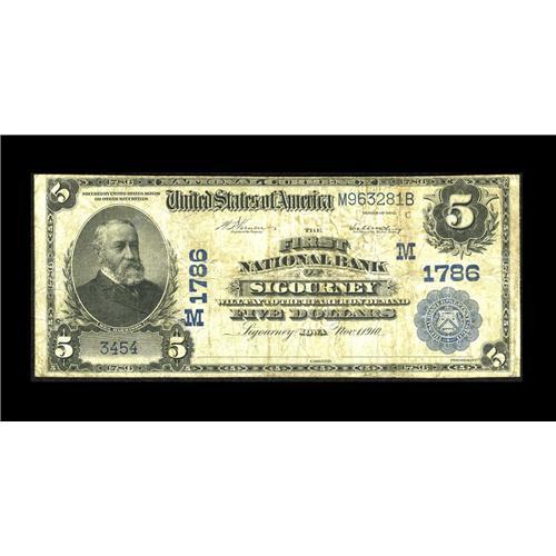 <B>Sigourney, IA</B></I> - $5 1902 Plain Back Fr. 601 <B>The First NB</B></I> Ch. # (M)1786<BR>An unusual town name for the first name aficionados. The signatures have faded on this <B>Fine</B></I> $5.