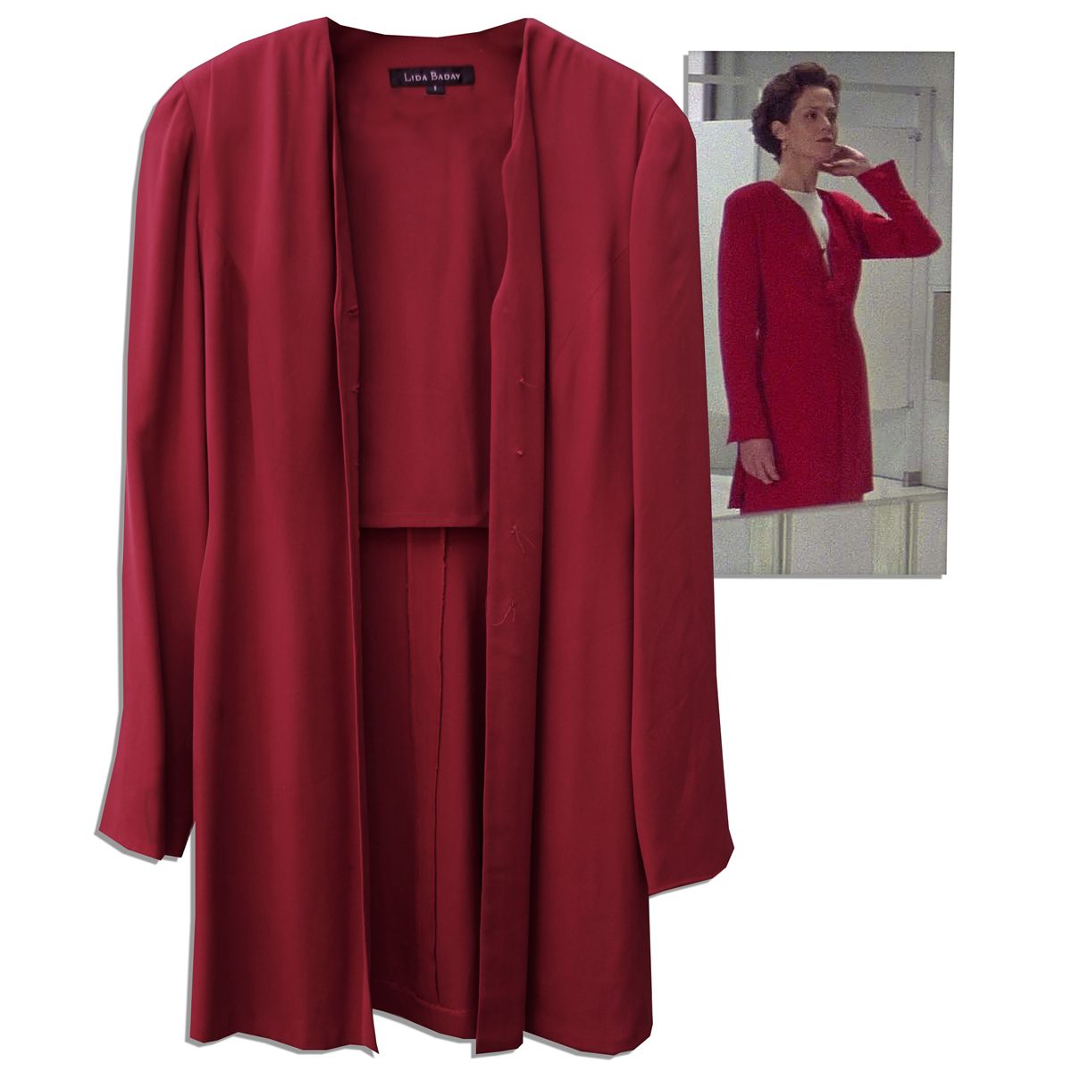 Sigourney Weaver wardrobe from 1995 serial killer drama ''Copycat''. Red silk jacket from the terrifying final scenes features the necessary missing buttons. Jacket by Lida Baday in size 8 hits just above the knee. Near fine. With a COA from the Prop Store.