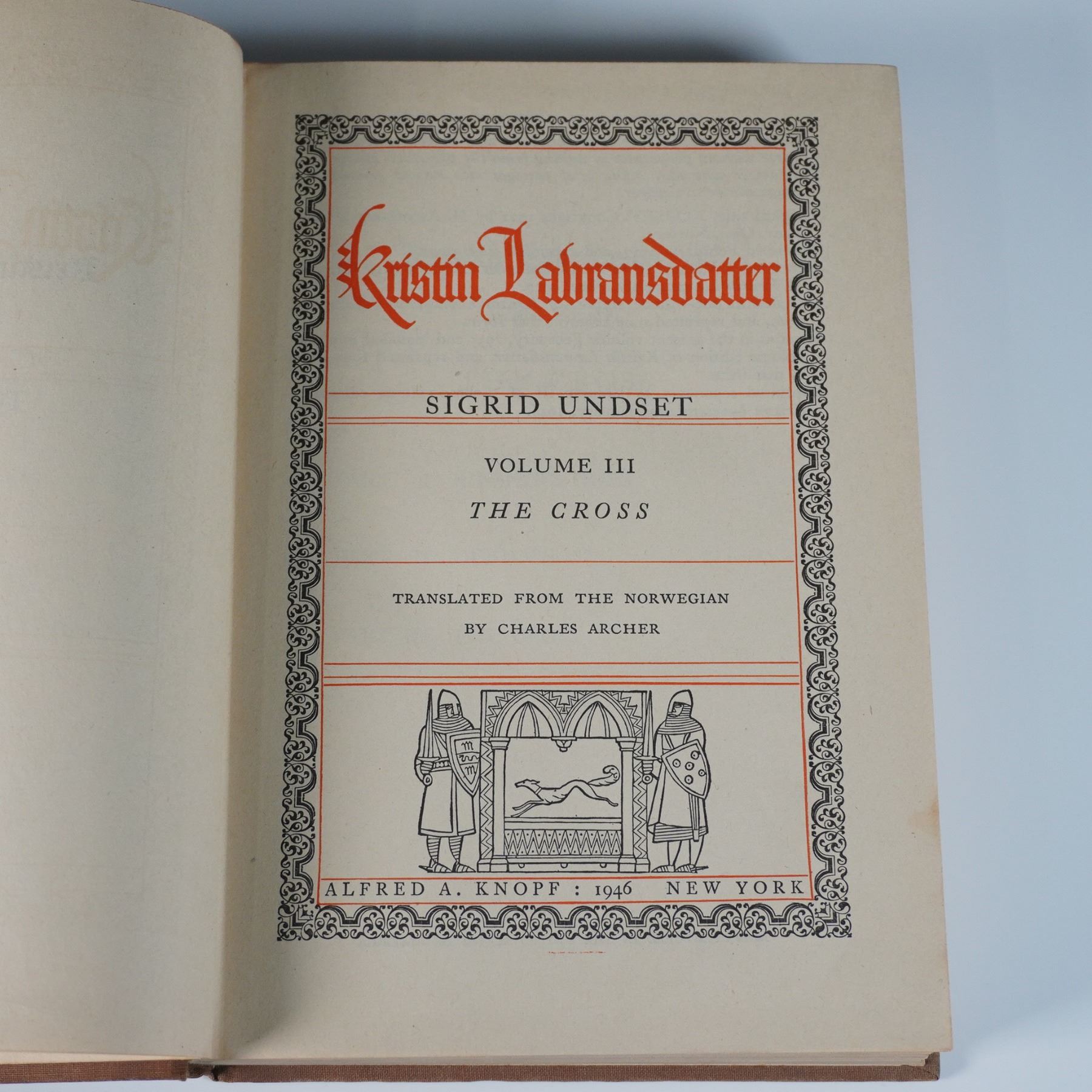 New York: Alfred A. Knopf, 1946. A historical novel by Nobel Prize-winning author Sigrid Undset, translated from Norwegian by Charles Archer. Volume III, The Cross, concludes the epic trilogy of Kristin Lavransdatter, set in medieval Norway.