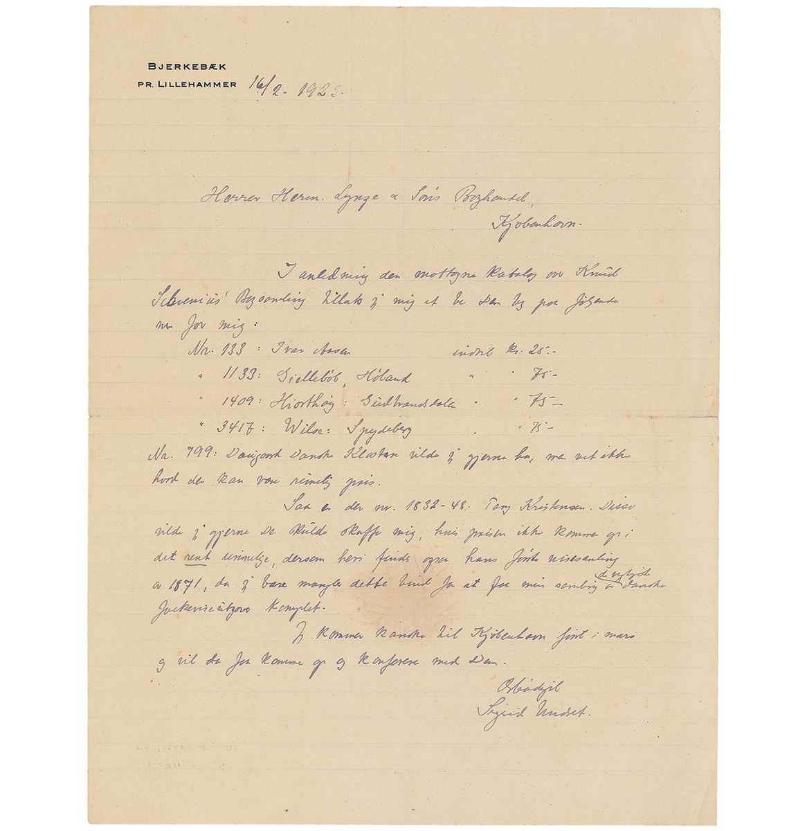 Norwegian novelist (1882–1949) who was awarded the Nobel Prize for Literature in 1928 and is best known for her Kristin Lavransdatter trilogy. ALS in Norwegian, one page, 8.5 x 11.25, personal letterhead, February 16, 1923. Untranslated auction order for the bookstore Lynge & Son's in Copenhagen. In fine condition, with intersecting folds, overall wrinkling, and light soiling.