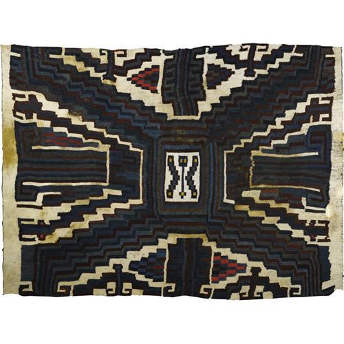 <B>Large Mantle</B></I><BR>Sihuas<BR>A.D. 100 - 400<BR>Camelid fiber, cotton<BR>Height 55 in. Width 76 7/8 in.<BR><BR>The design is organized around a large X-shape centered by a rectangle. On a white ground this central rectangle contains a radically stylized human figure with arms and legs forming a disjointed X, the axis of which is perpendicular to that of the large X-shape. All of the linear design extensions progress in steps, which give great vibrancy to the entire surface. The overall mantle rectangle is completed by four pyramidal units in the outer spaces formed by the central X. Two of these, taller and narrower in proportion, have a double-headed serpent motif around an ambiguous central unit. The shallower, broader pyramidal spaces are filled with symmetrically balanced geometric stepped-terrace shapes. The implied overall ground color is white, with the other principal colors being dark hues of a least three shades of blue and two of cochineal red. Small squares of pale gold appear solely in the central motif. The overall condition is fair, with numerous loss areas and some replacement patches.<BR><BR>Provenance<BR>Butterfields, San Francisco: sale 7307E, 25 March 2002, lot 5036, p.11, ill. p.10<BR><BR> <BR><BR><B>Importan