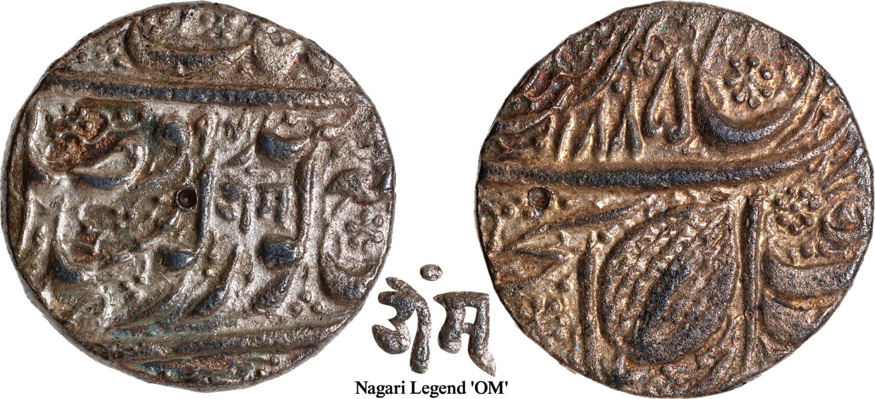 Sikh Empire, Kharak Singh (VS 1896-1897/1839-1840 AD), Sri Amritsar Mint, Silver Rupee, Nagari "Om" Type, VS 1885/97, 'Nanak Shahi' Couplet, Obv: Persian legend "Sikka zad bar har do Alam fazal-e-Sachha Sahib ast, fateh tegh-i-Guru Gobind Singh Shah Nanak wahab ast", with "Om" in Nagari, Rev: Persian legend "zarb Sri Amritsar" with Vikram Samvat year 1885 at the top & "takht Akal bakht" with pipal leaf mark, 10.91g, 23.51mm, (KM # 22.4 /Herrli # 01.11.04 /Saran & Dalwinder # AM 249j), test marks, toning, about very fine, Rare.