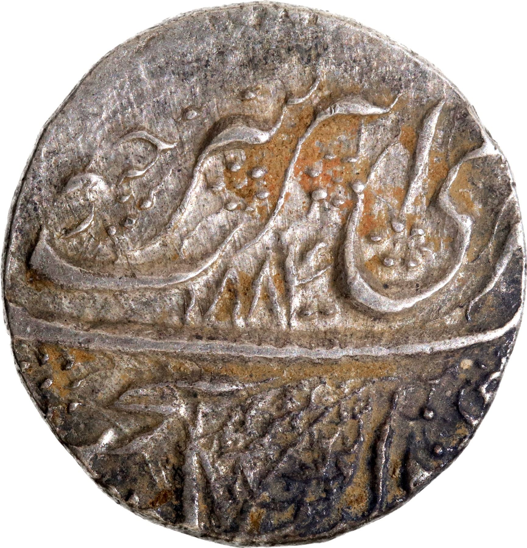 Sikh Empire, Ranjit Singh (VS 1856-1896 /1799-1839 AD), Sri Amritsar Mint (Completely visible), Silver Rupee, VS 1884 /90, ‘Nanak Shahi’ Couplet, Obv: Persian legend "Sikka zad bar har do alam fazl-e-sachha sahib ast, fateh tegh-i-Guru Gobind Singh Shah Nanak wahab ast", Rev: Persian legend "zarb Sri Amritsar jiyo" almost completely visible with frozen Vikram Samvat year 1884 at the top, "takht Akal bakht", & pipal leaf symbol, 11.15g, 24.15mm, (Unlisted in KM/Saran & Dalwinder # AM 242na), no test mark, about very fine, Very Scarce.
