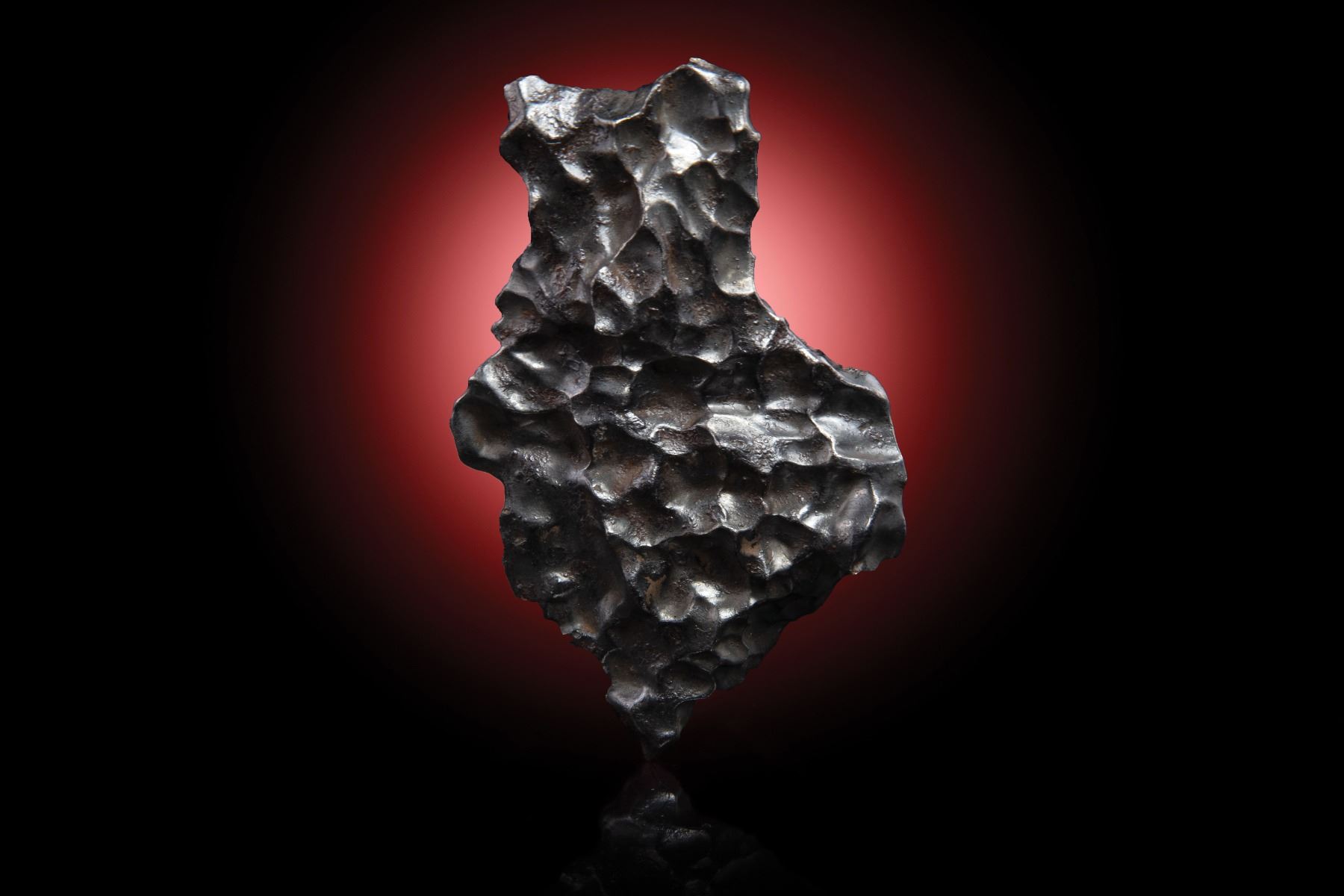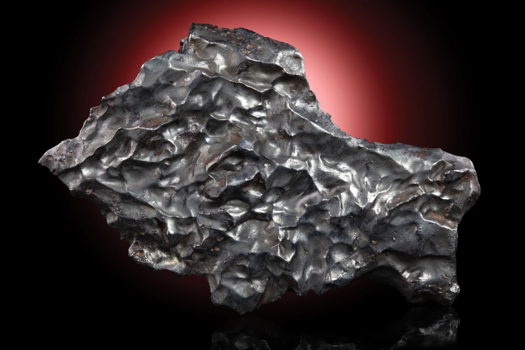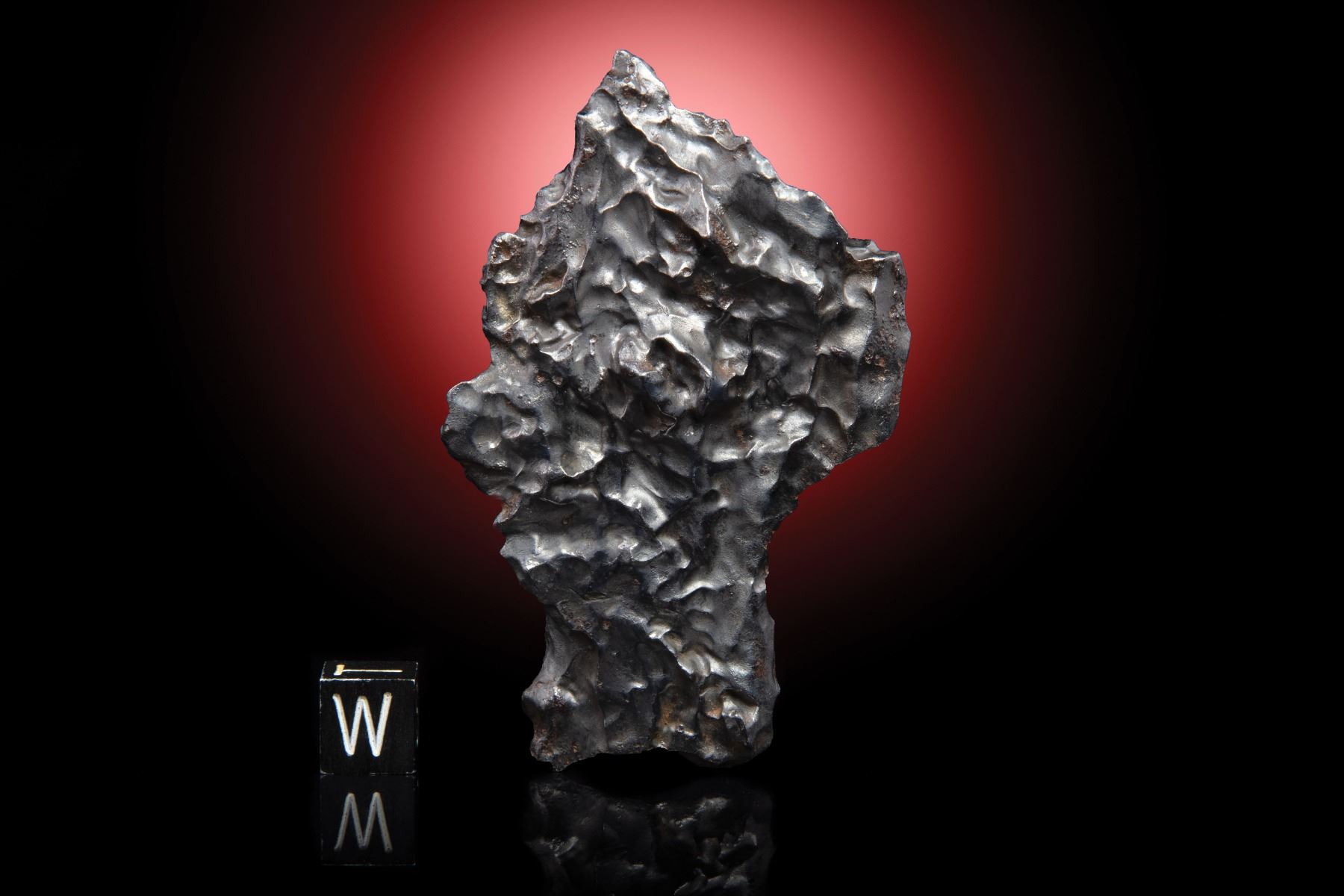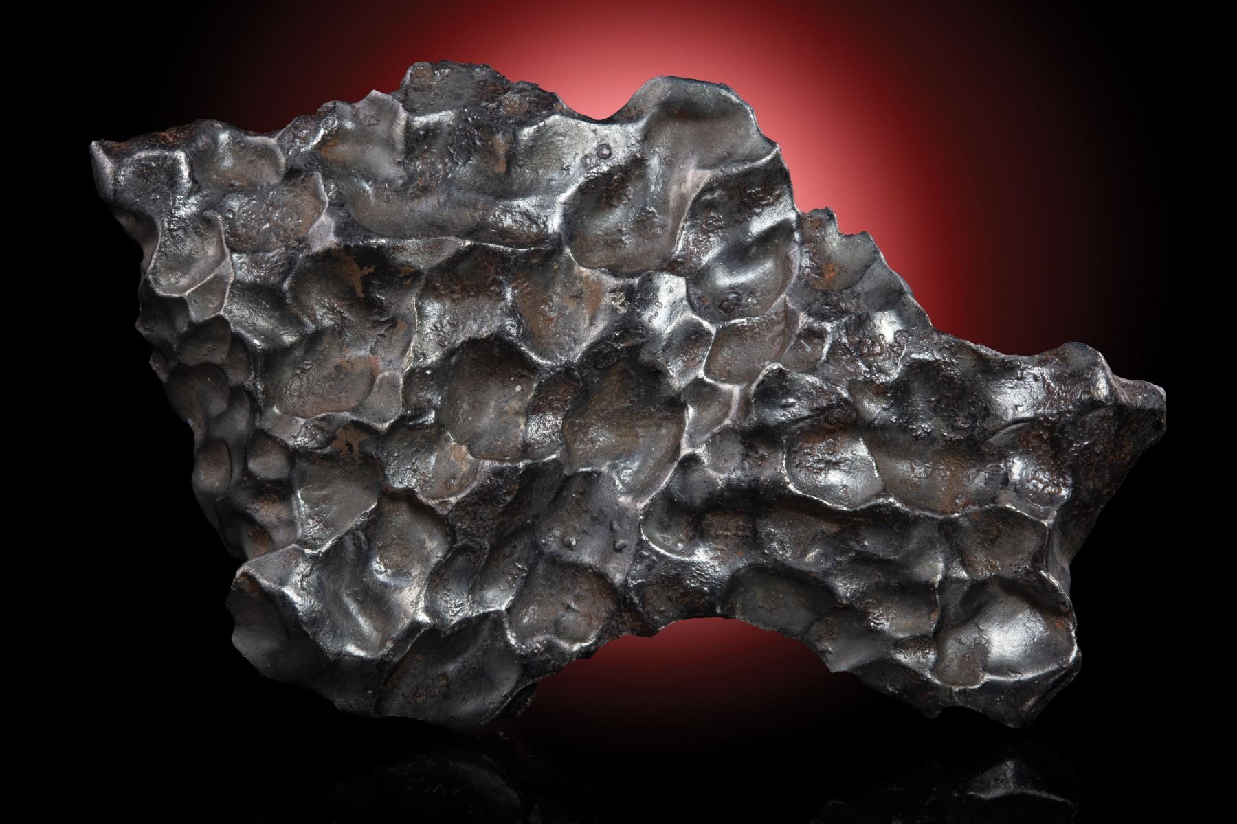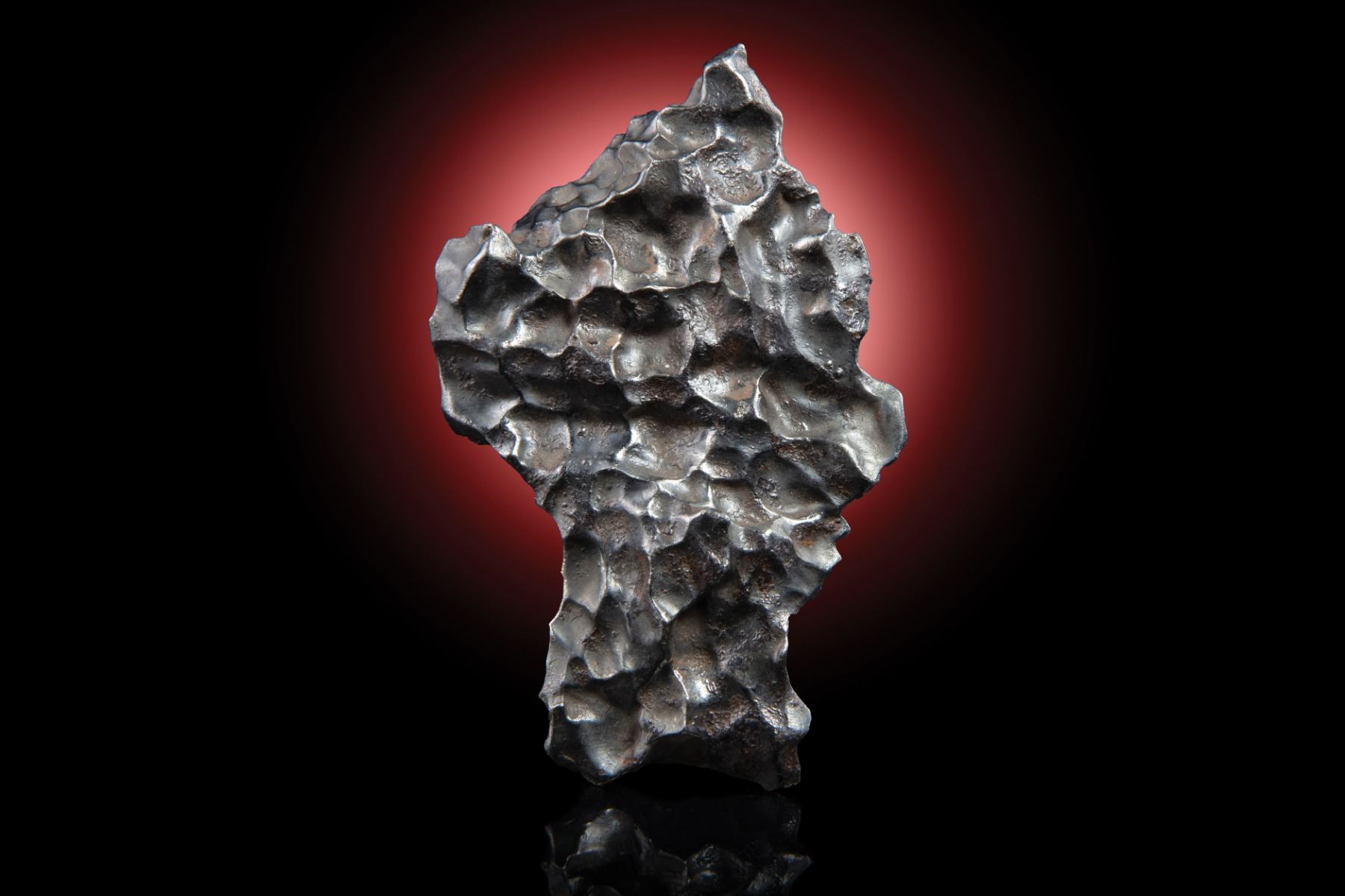 From the personal collection of Geoffrey Notkin. Iron meteorite, IIAB. Witnessed fall February 12, 1947, eastern Siberia. Intriguing individual with abundant regmaglypts weighing 80.2 grams and measuring 73 mm x 44 mm x 11 mm. Regmaglypts, also known as “thumbprints,” are oval depressions of varying size found on the surface of many meteorites. These indentations resemble the marks a sculptor might make with his or her thumbs on a wet lump of clay, hence their name.
