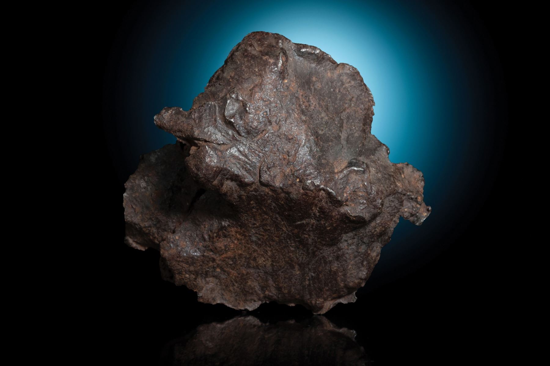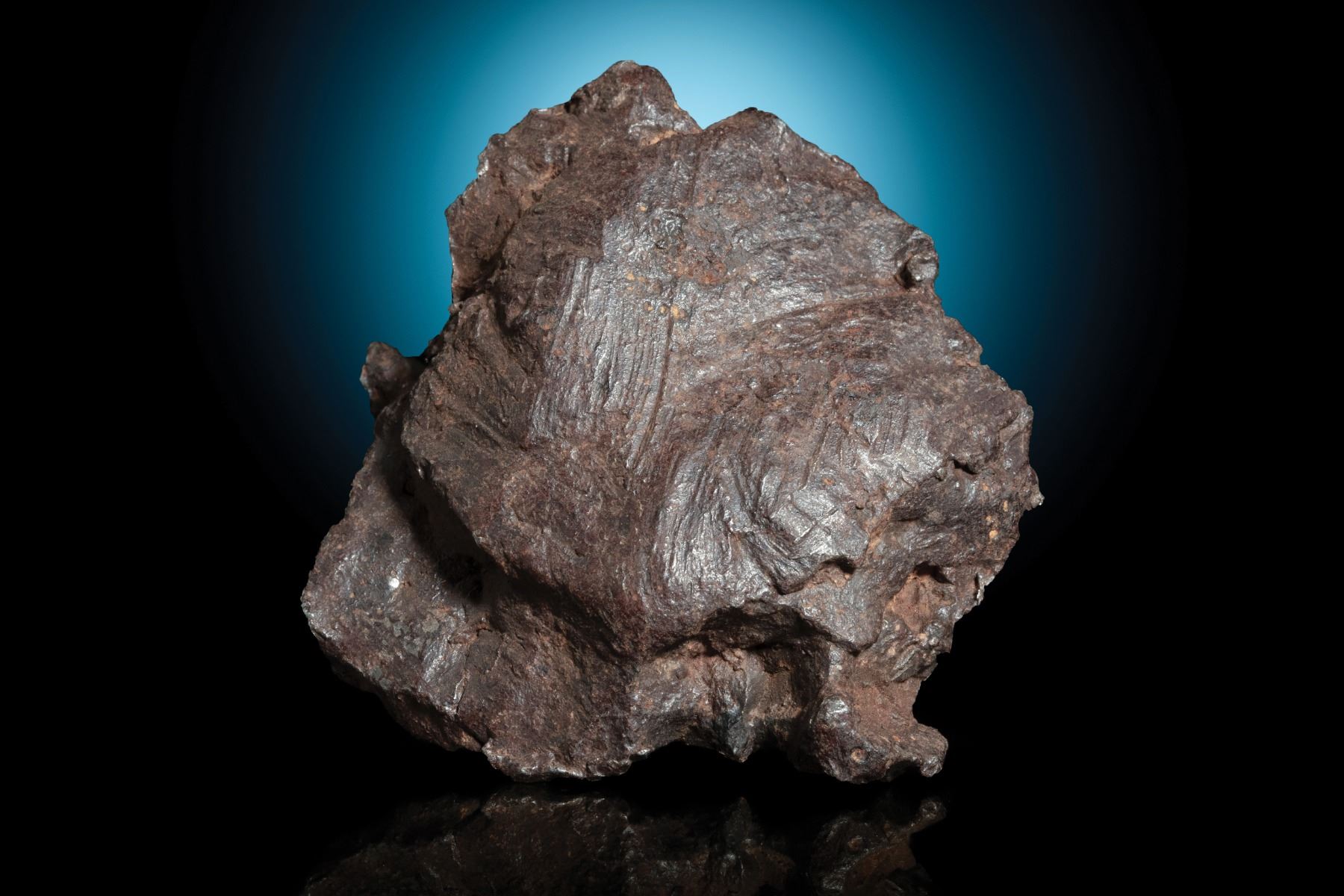 Iron meteorite, IIAB. Witnessed fall February 12, 1947, eastern Siberia. Rare uncleaned shrapnel weighing 179.0 grams and measuring 55 mm x 55 mm x 26 mm. The vast majority of recovered Sikhote-Alin specimens were cleaned by the finders, their helpers, or family members, as it was believed that the resulting shiny, silvery pieces would carry more appeal on the collectors’ market. However, cleaning will often remove some of the surface features unique to meteorites, such as fusion crust and delicate flowlines. Uncleaned, as-found pieces show an attractive bronze or ocher patina and examination with a loupe or magnifying lens will sometimes reveal intriguing surface details. While individual Sikhote-Alin meteorites display alluring features and appeal to the aesthetically-inclined, shrapnel fragments such as this—found in and around the large number of craters at the fall site—brilliantly illuminate the savage forces inflicted upon incoming meteorites.