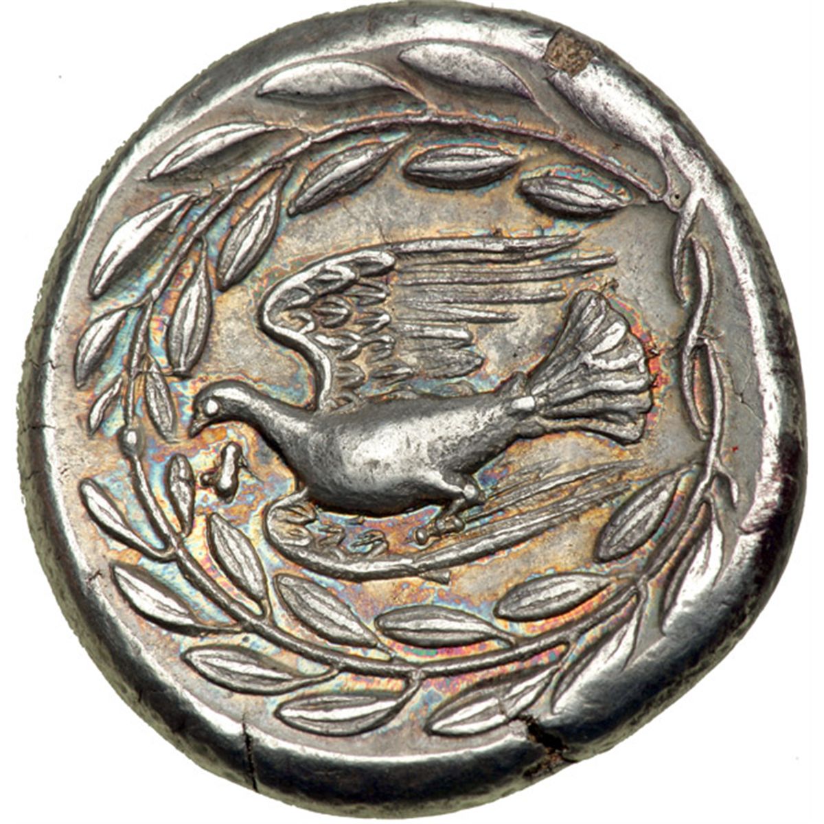 Sikyonia, Sikyon. 335-330 BC. AR Stater (12.2 g). Chimaera standing left; wreath above, sigma and epsilon below. Reverse: Dove flying left; I before; all within wreath. BCD Peloponnesos 219; BMC 56. Excellent metal, well centered with lovely delicate iridescent toning. A beautifully perserved specimen. Superb Extremely Fine. .