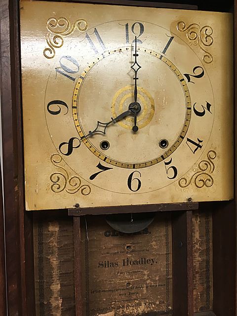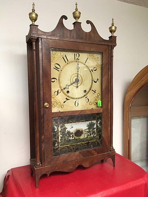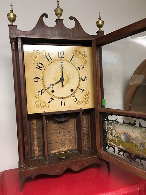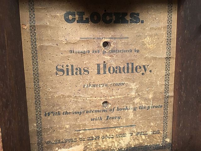 Silas Hoadley, Plymouth, CT pillar and scroll with 3 brass urn finials, reverse painted tablet, raised gold gilt original dial, open diamond hands, wooden works, very nice label "Arranged and Manufactured by Silas Hoadley, Plymouth (Conn.)", pendulum, measures approx. 31" tall x 17" wide x 4" deep. Many Silas Hoadley Clocks which depict a home or building on the reverse painted glass tablet, are actual homes in the Town of Plymouth and surrounding Connecticut towns of the time period.