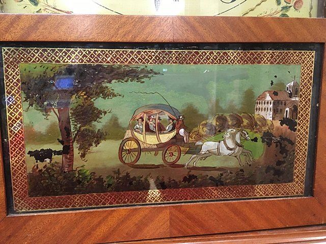 Silas Hoadley "Upside Down" Pillar and Scroll Clock, Plymouth Connecticut, c. 1820, scroll top case, with brass finial urns, beautiful hand painted dial and reverse painted glass tablet featuring horse and carriage scene, thirty-hour "upside-down" wooden movement, weight driven, no label. Measures approx. 29" tall x 16" wide x 4" tall.