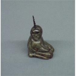 An emerald green carving of a seated Shaman with a narwhale tusk protruding from his head, signed in Roman and dated on the underside.