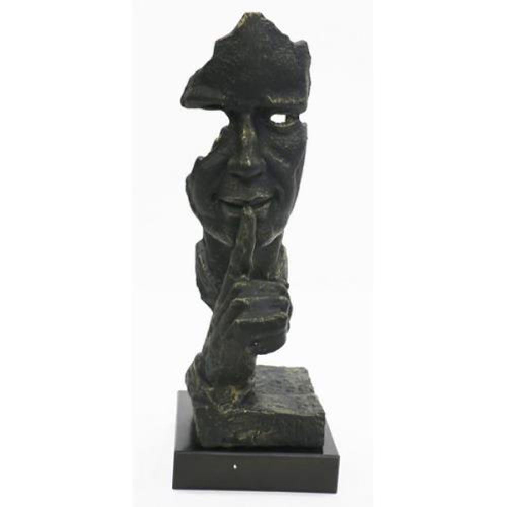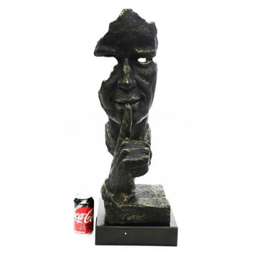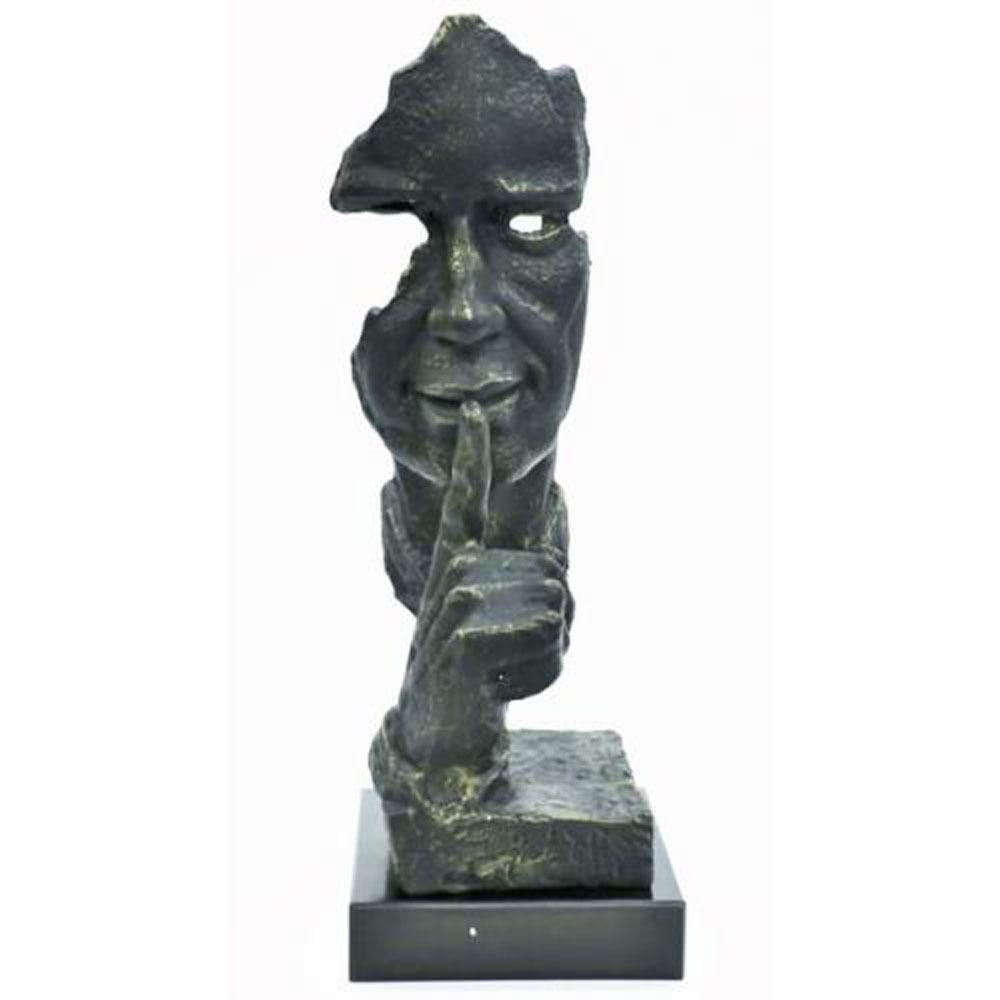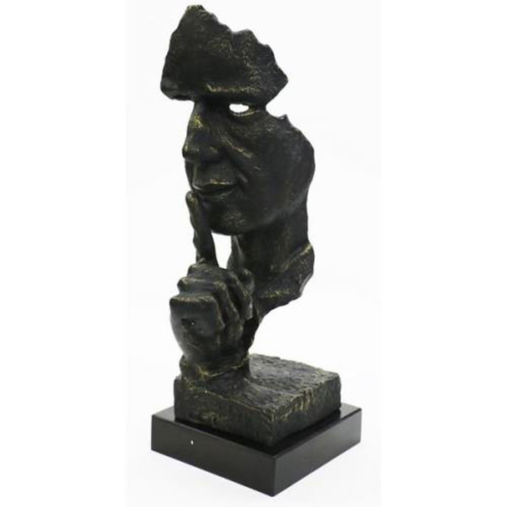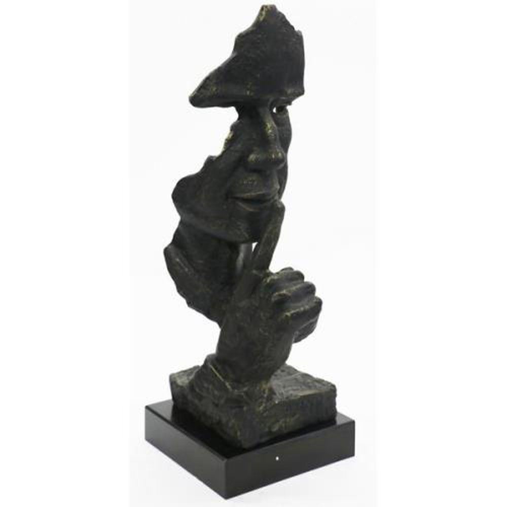 The modern art sculpture with the title Silence is an abstract figure that was created as homage, the amazing Surrealism artist. Silence is a simple designed sculpture of a face that is designed like a mask and asking for silence by its raised index finger. This modern bronze sculpture was made of 100% finest bronze and was affixed on a solid base made of marble. Little details like the filigree and detailed designed facial expression make this bronze a real high quality product. Bronze Dimensions with Marble Base: Height 28 X Width 10 Inches. Weight: 30 LBS.