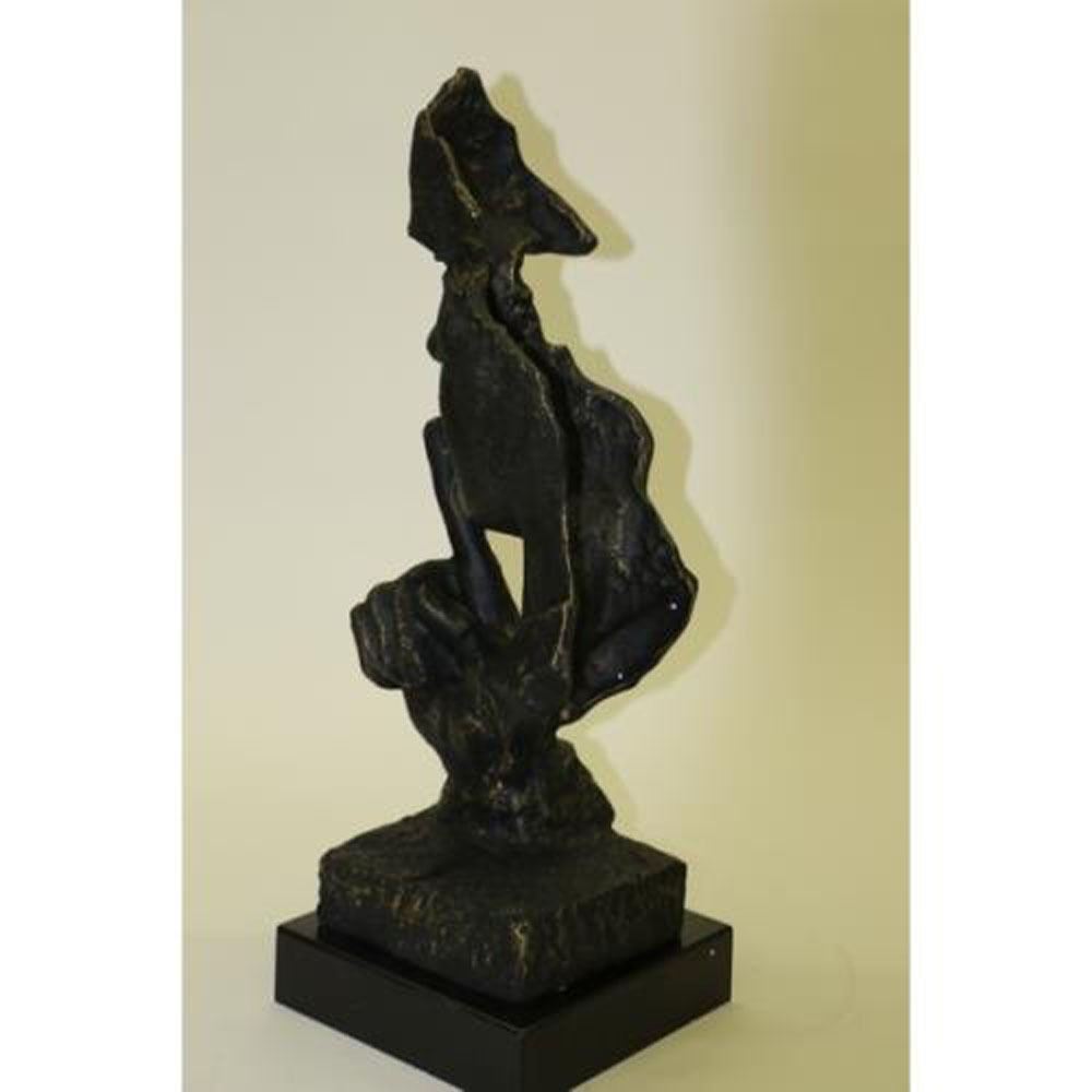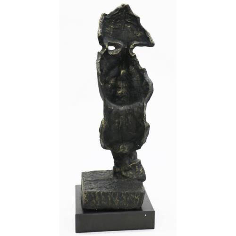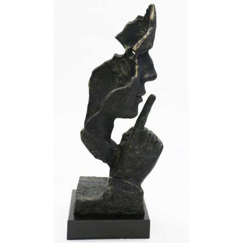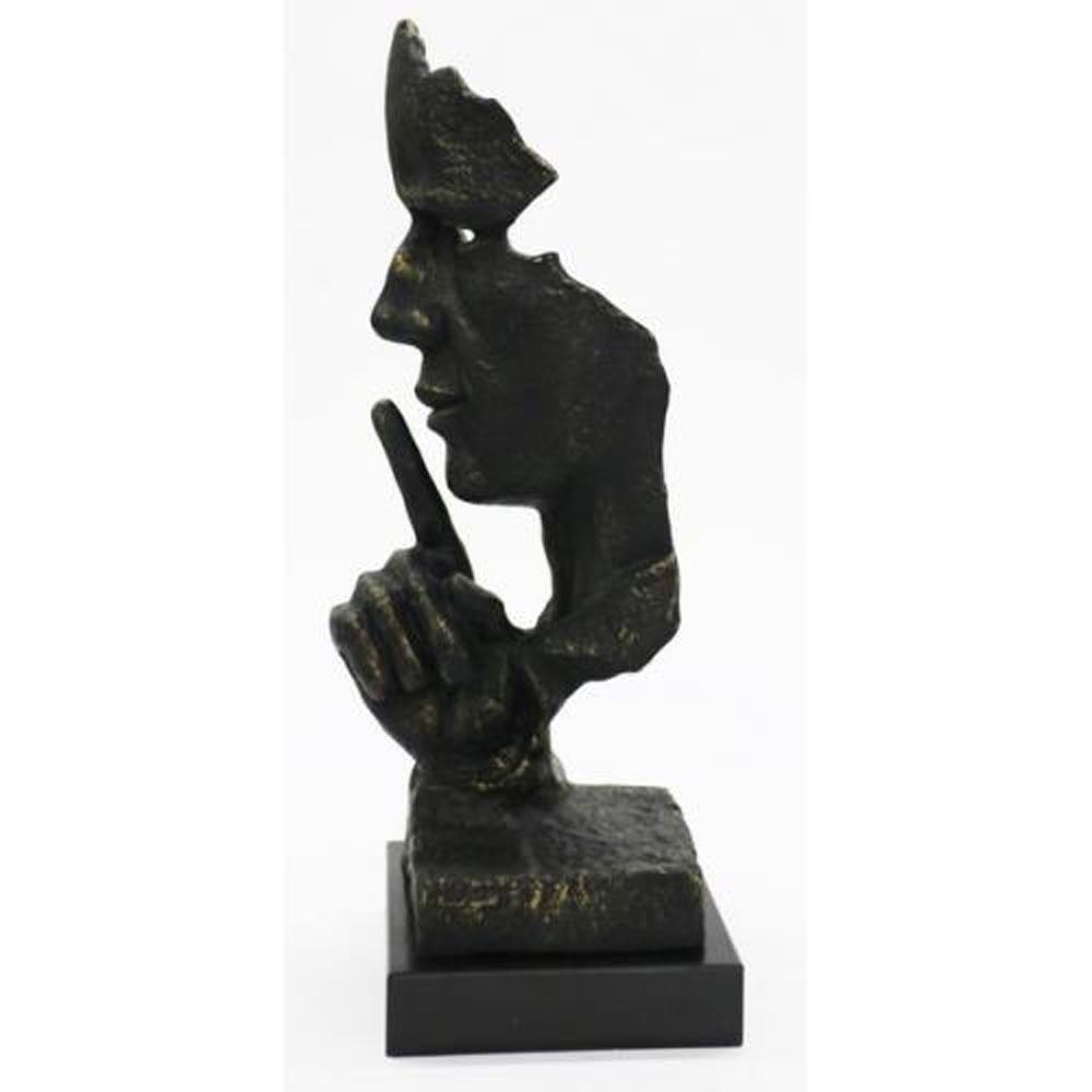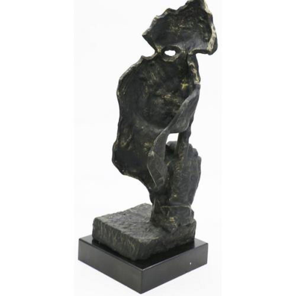 The modern art sculpture with the title Silence is an abstract figure that was created as homage, the amazing Surrealism artist. Silence is a simple designed sculpture of a face that is designed like a mask and asking for silence by its raised index finger. This modern bronze sculpture was made of 100% finest bronze and was affixed on a solid base made of marble. Little details like the filigree and detailed designed facial expression make this bronze a real high quality product. Bronze Dimensions with Marble Base: Height 28 X Width 10 Inches. Weight: 30 LBS.