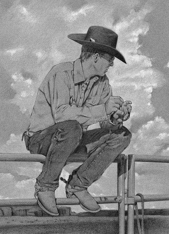 Artist: Rob Richards. Title: Silent Count, by Rob Richards. Size: 15" x 10". Description: "During branding, the cattle are rounded up into groups to make things more manageable for the working cowboys. As they are run from pen to pen someone is assigned to keep track of the amount in each group. The cattle go so quickly it is wise to be able to keep a silent count." -R.R.