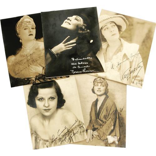 <B>Silent-Era Starlets Signed Photos.</B></I> A set of vintage b&w photo portraits signed by Agnes Ayres, Barbara Kent, Norma Shearer, Laura LaPlante, and Alla Nazimova. The photos range in size from 6" x 8" to 7" x 8.5" and are in overall Fine condition with moderate tanning and mild to moderate wear.<BR><BR><b>Shipping:</b> Other (oversized items, group lo (<a target="_blank" href="http://www.heritageauctions.com/common/shipping.php">view shipping information</a>)