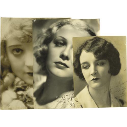 <B>Silent-Era Starlets Signed Photos.</B></I> Set of three inscribed and signed vintage b&w photos includes a 6.5" x 8.5" shot of Mary Philbin, an 8" x 11" shot of Gloria Stuart, and an 8.5" x 11" shot of Madge Bellamy. The photos are in overall FIne to Very Fine condition with moderate tanning and mild wear, tack holes tot he corner of the Stuart photo, and some very small wormholes to the Philbin photo.<BR><BR><b>Shipping:</b> Other (oversized items, group lo (<a target="_blank" href="http://www.heritageauctions.com/common/shipping.php">view shipping information</a>)