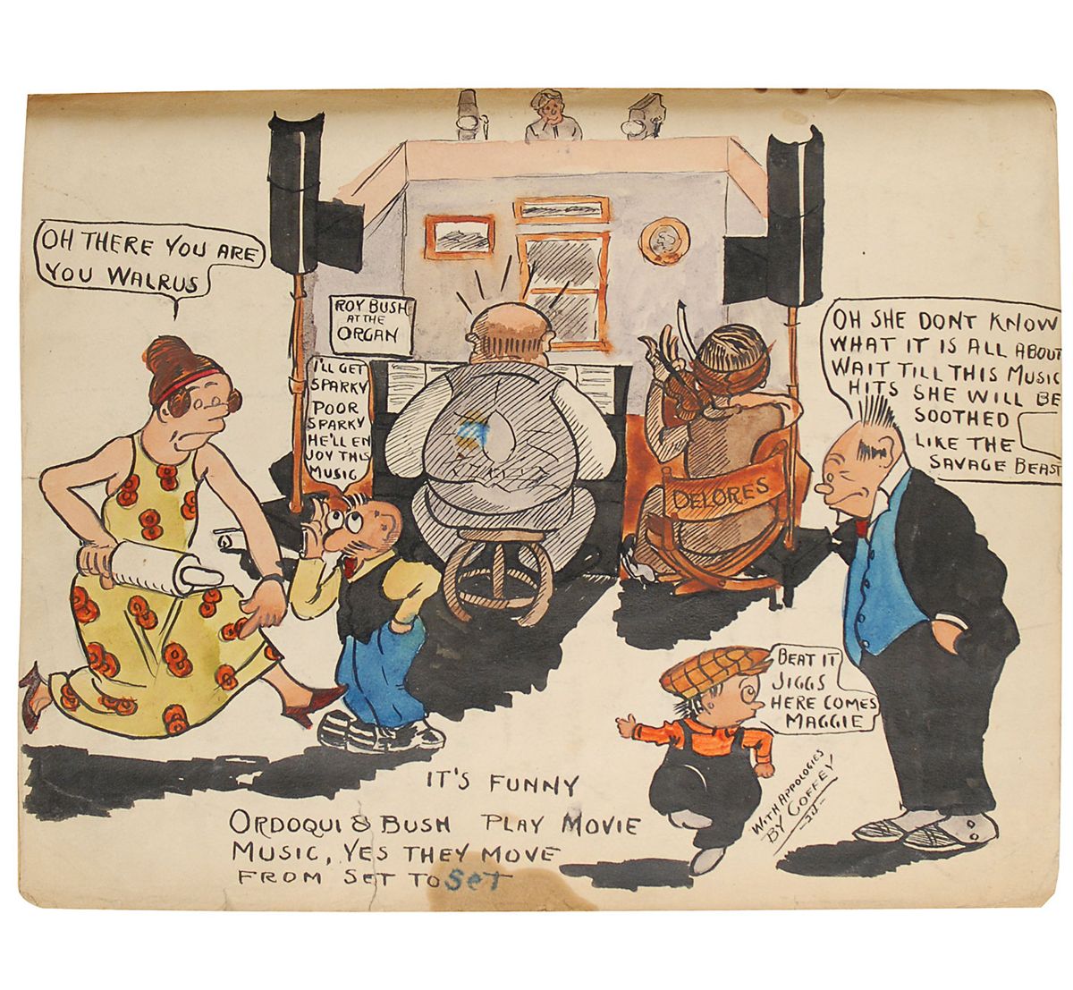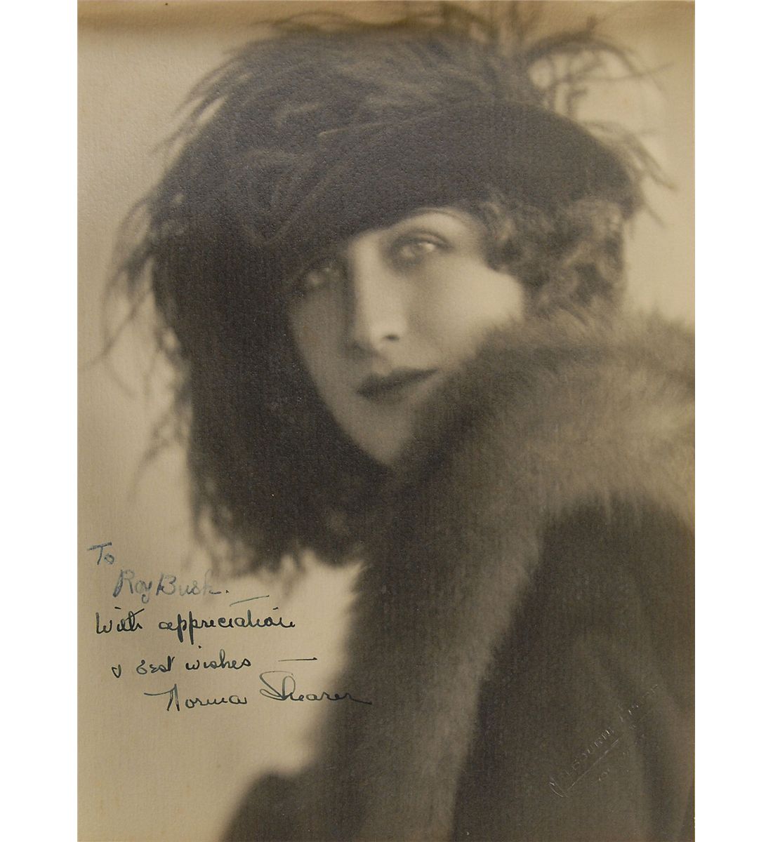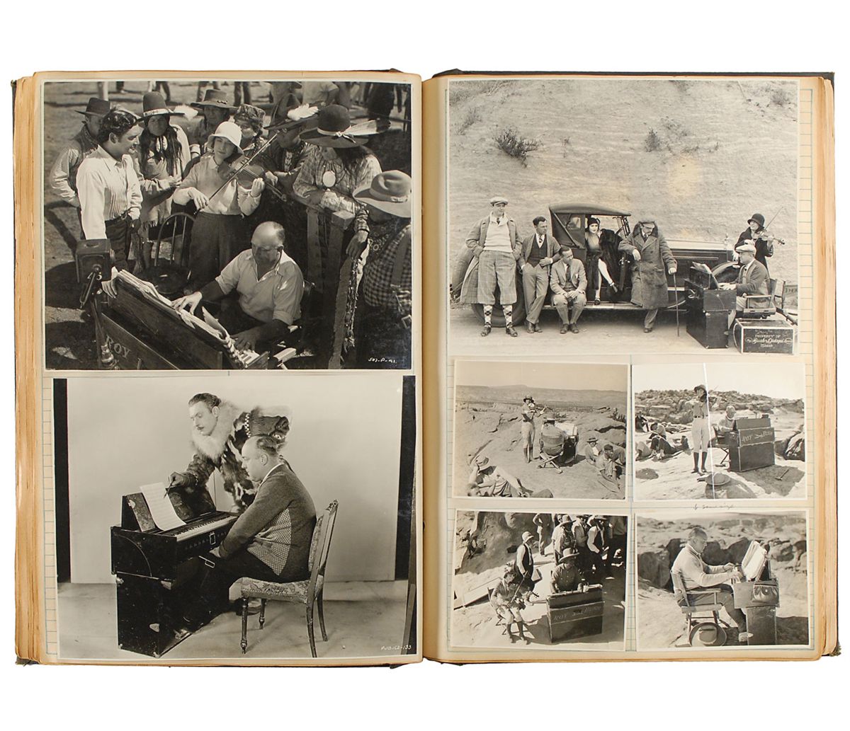 Exceptional scrapbook album owned by Hollywood pianist Melvin Leroy ‘Roy’ Bush, 11 x 16, containing 40 signed photos—the great majority inscribed to “Roy”—and just over 100 fascinating unsigned photos from film sets. The majority of the signed photos measure approximately 8 x 10, with oversized or smaller images indicated in parentheses. Signers include: Norma Shearer, Clara Bow (oversized), Constance Talmadge (oversized), Lilyan Tashman (oversized), Jack Dempsey, Evelyn Brent (oversized), Bobby Agnew, Mary Brian, June Collyer, Philippe De Lacy (5 x 7), Harrison Ford (silent film actor, 1884-1957), Robert Frazer, John Gilbert, Gaston Glass, Elinor Glyn, Neil Hamilton, Frankie Lee, Beatrice Lillie (oversized), Anita Louise, Katherine MacDonald, Harry T. Morey, Conrad Nagel, Miriam Seegar, Pauline Starke, Lewis Stone, Virginia Valli (oversized), Walter Wilkinson, and 13 others. There is also a large original drawing in the style of George McManus’s ‘Bringing Up Father’ cartoon, signed “Coffey,” showing Bush at his piano. The unsigned photos primarily measure between 9 x 7 and 10 x 8, and show film sets, actors and actresses, and other details of production; many of them include Bush as a subject, generally seated behind his little upright piano. In overall very good to fine condition. Bush was born on August 21, 1889, and was employed by movie studios during the late silent era, building a house in Culver City in 1922. He was evidently close to many of the cast members he worked with, given the warm, friendly inscriptions to him found on the photos in this collection. Combining the classic, rare, and obscure, this is an absolutely unique collection from the early days of cinema.