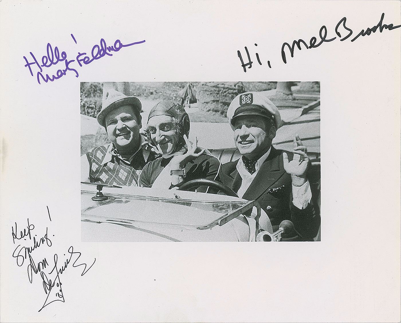 Wonderful semi-glossy 10 x 8 photo of Mel Funn, Marty Eggs, and Dom Bell from the 1976 comedy Silent Movie, signed in black felt tip, "Hi, Mel Brooks," in purple felt tip, "Hello! Marty Feldman," and in black ink, "Keep smiling! Dom DeLuise." In fine condition. From the Harvey and Rhoda Kuflik Collection.